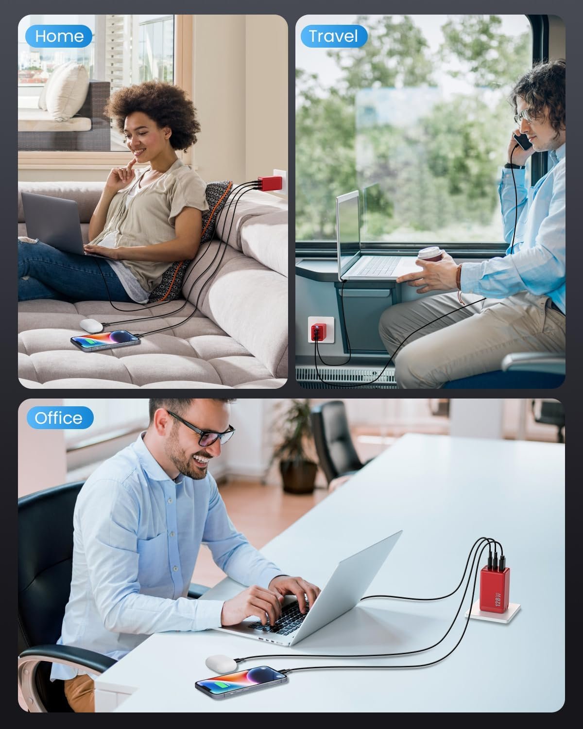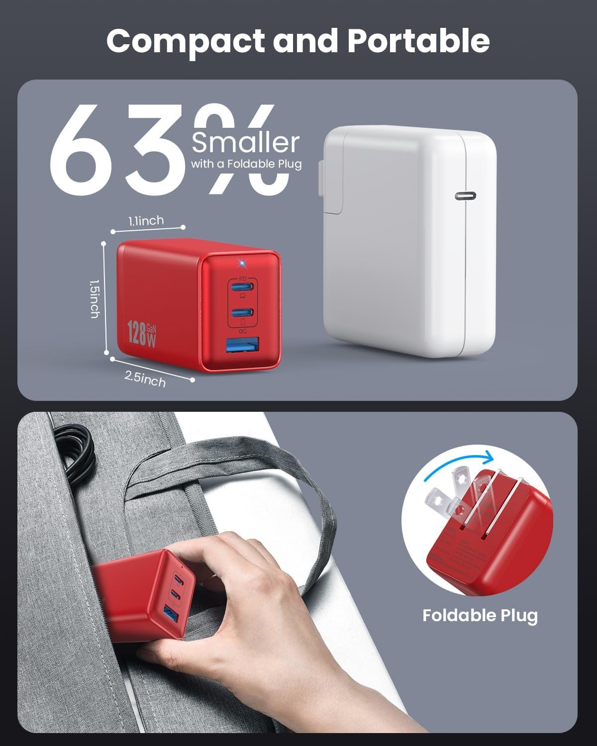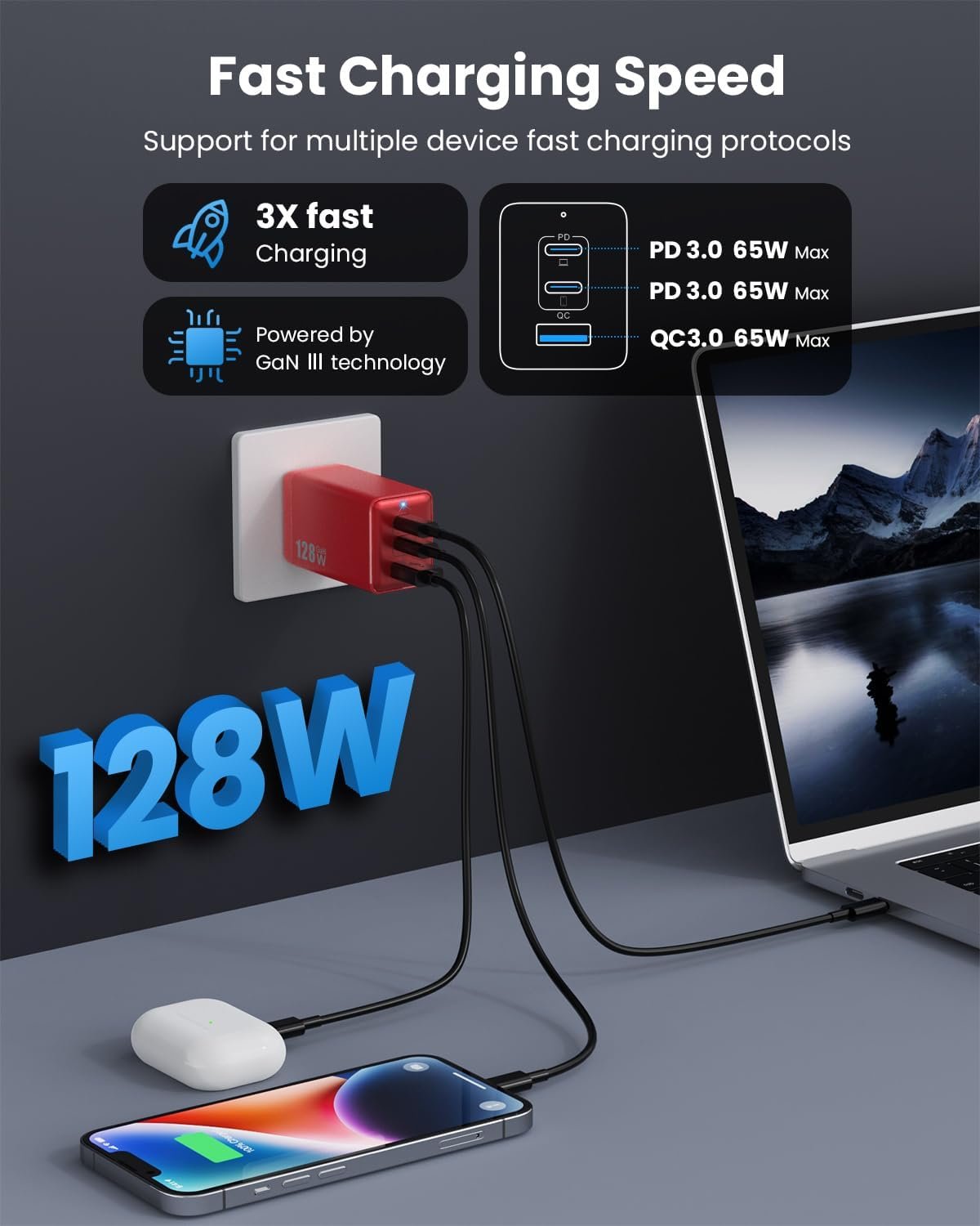 128W USB C Wall Charger,GaN III 3-Port Fast Charging Station,PD QC Foldable Charger Block Portable 65W Laptop Adapter for MacBook Pro/Air,iPad Pro,Galaxy S23,Dell XPS 13,iPhone 17/16/Pro etc