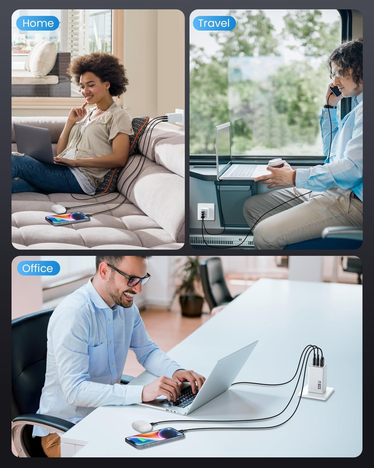 【Efficient Charging & Wide Compatibility】This 3 Port GaN III charger is able to charge 1 laptops and 2 smartphones/tablets at the same time. All ports support (quick charge) agreement, it’s compatible for MacBook Pro/Air, iPhone 17, iPhone 16, iPhone 15 or previous models, iPad Pro/Air, Galaxy S10 or previous models, Google Pixel, Dell XPS, Switch, and more.
