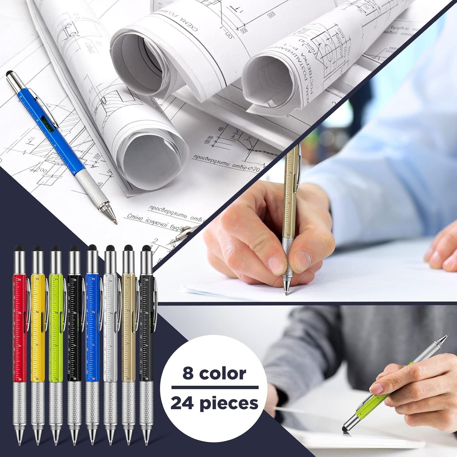 24 Pcs Multitool Pen 6 in 1 Screwdriver Pen Gadget Stocking Stuffers Christmas Gifts for Dad Multitool Pen with Touch Screen Stylus Top Ruler Level Gauge Screwdriver Black Refills Bags for Men Father