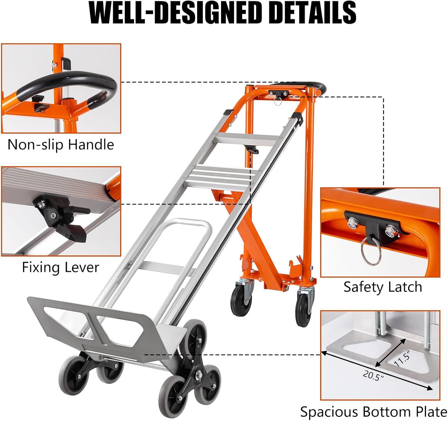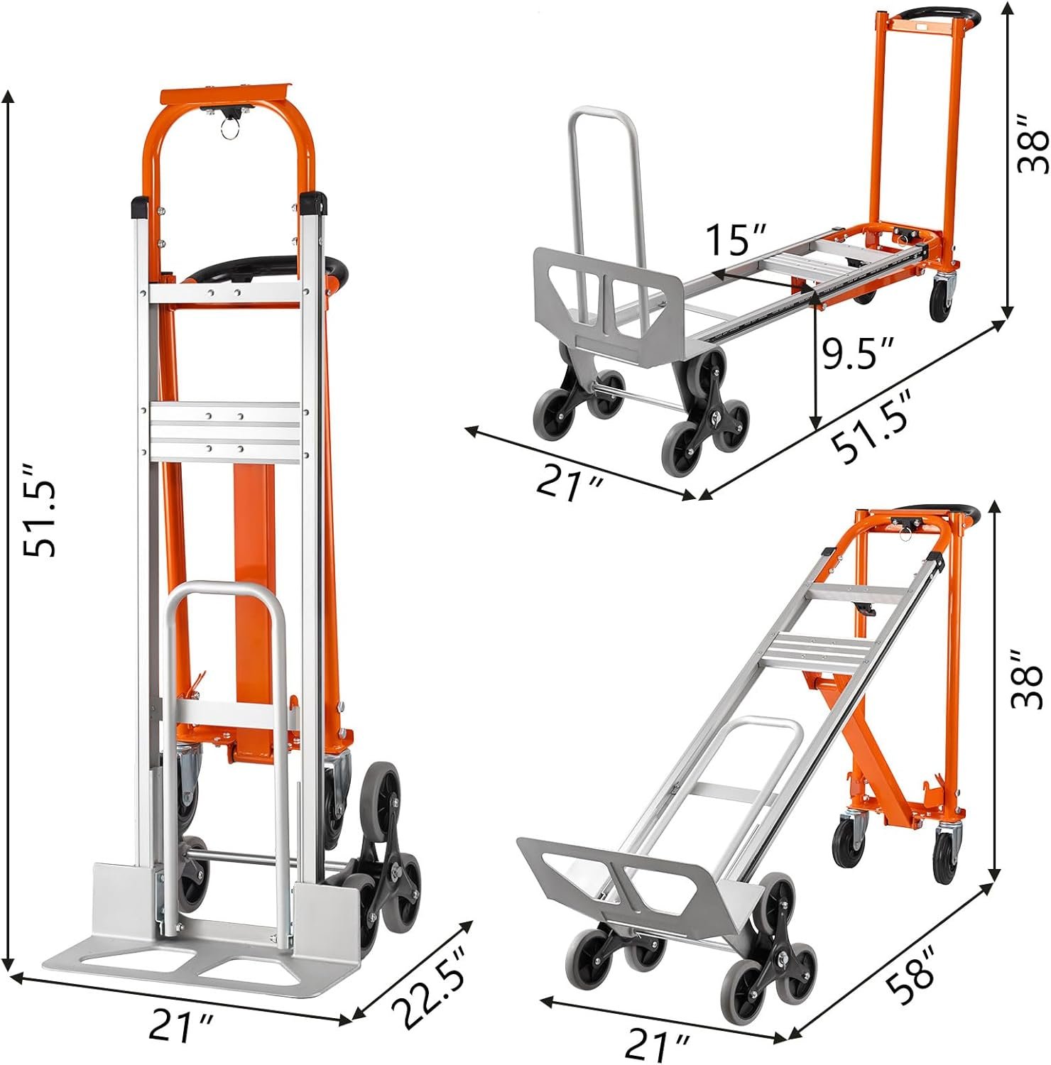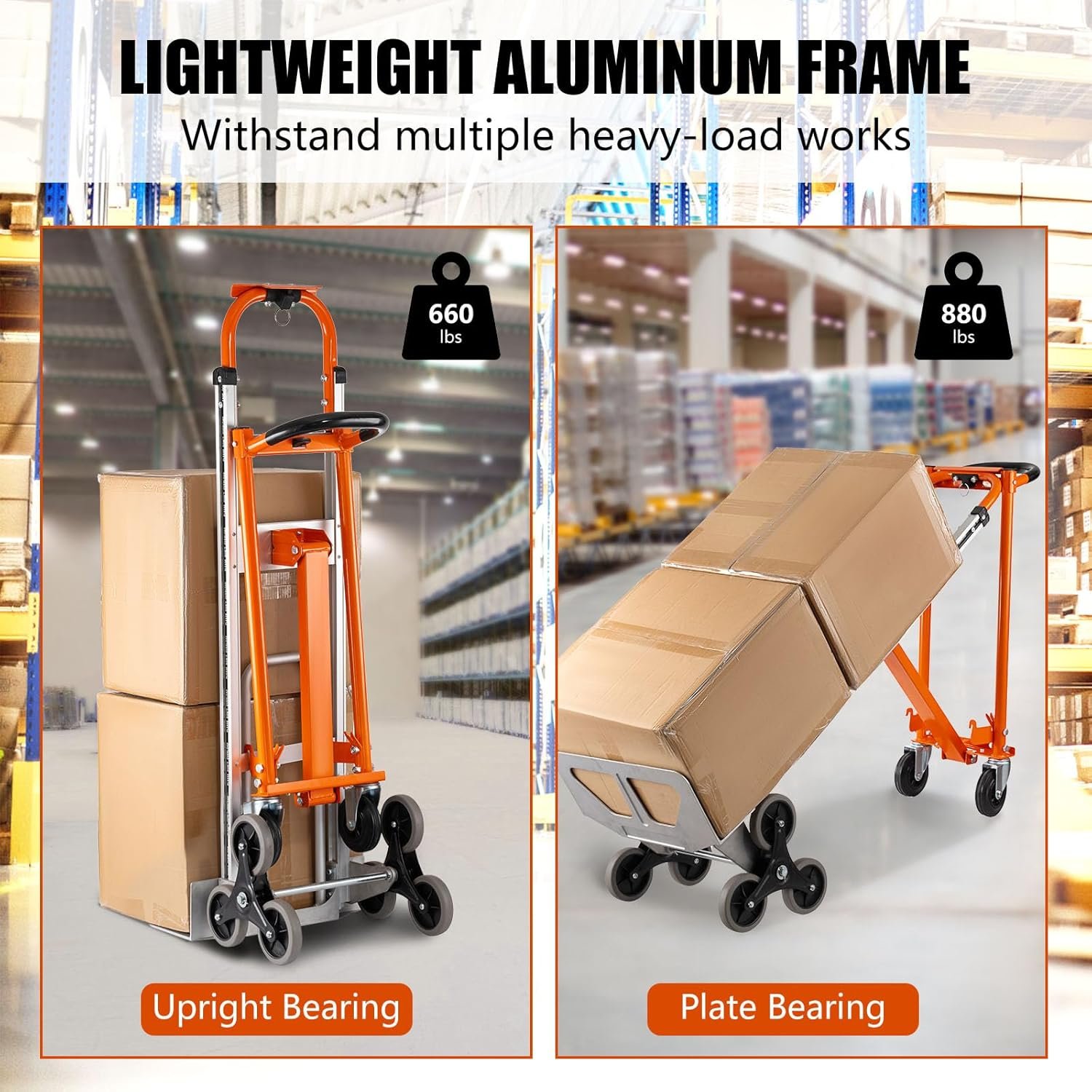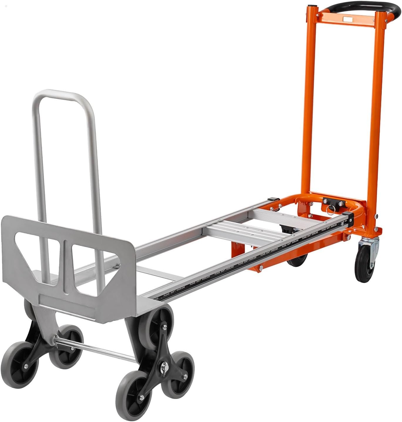 Durable aluminum construction660-lb. capacity in hand truck/Stair Climber mode880-lb. capacity in platform truck mode5″ rubber wheels walk stably and quietly on various grounds.Includes plate extender to ease the handling of large loadsErgonomic continuous flow handle for comfort