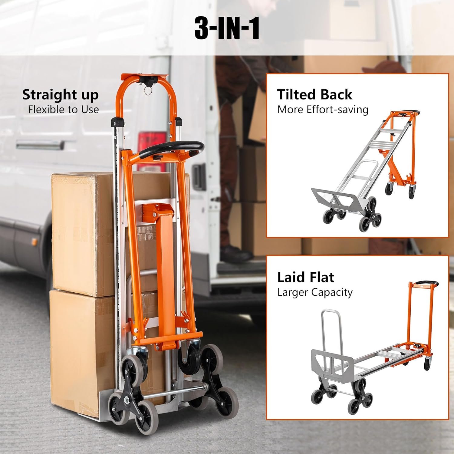 3 IN 1 Convertible Hand Truck — This hand truck features a versatile design that effortlessly converts from a 2-wheel vertical position to a 4-wheel horizontal position without requiring any bolts or screws. It offers 3 adjustable positions, allowing for quick and easy conversion in just one second. You can switch between a 2-wheel mode for vertical carrying, a 4-wheel dolly configuration, or a 4-wheel platform cart setup, adapting to different transport needs seamlessly.