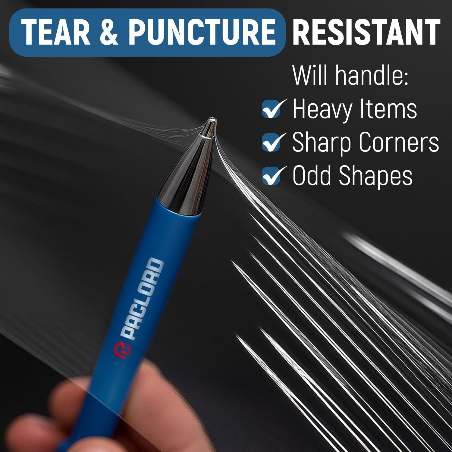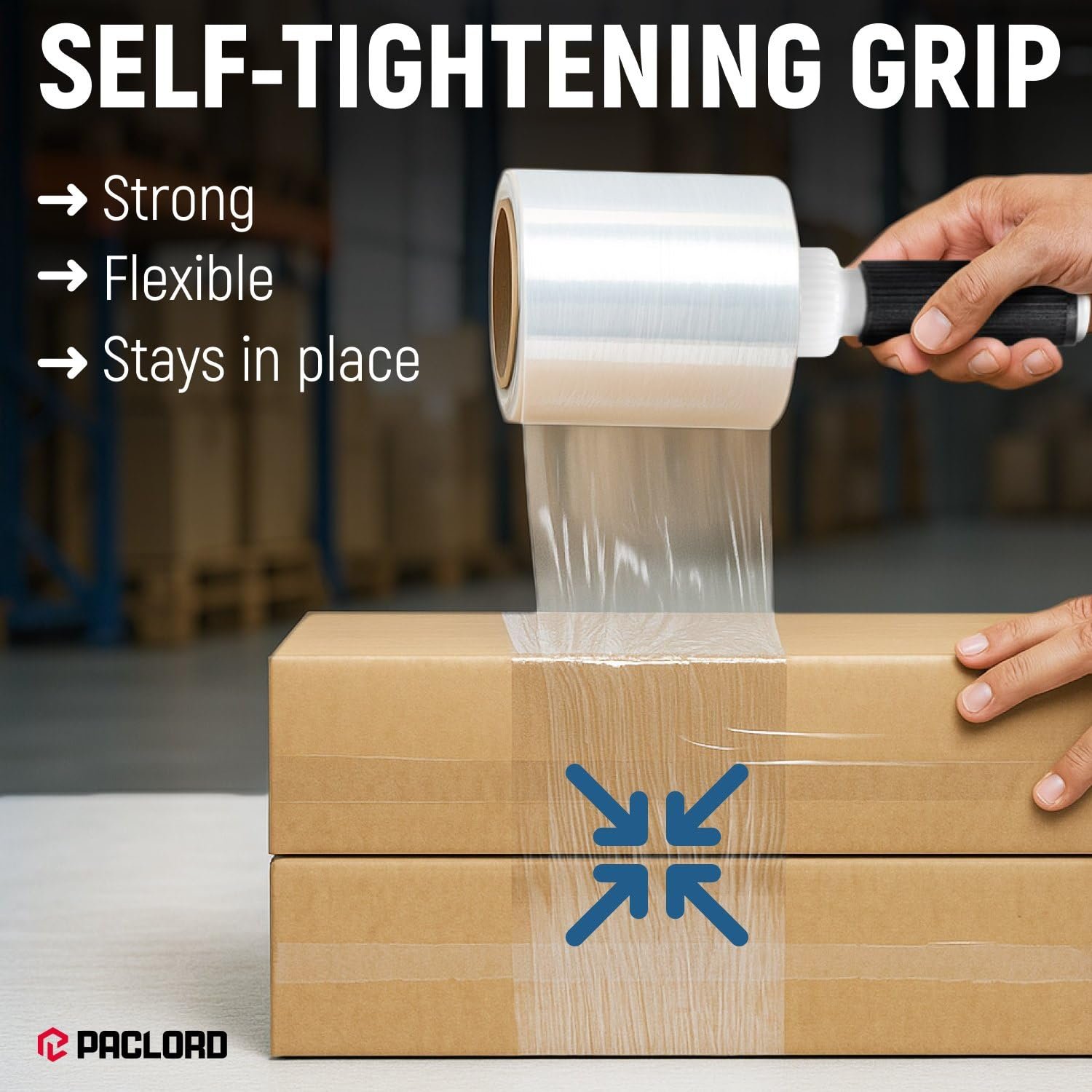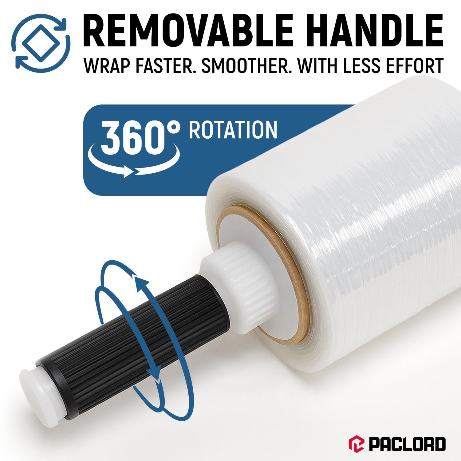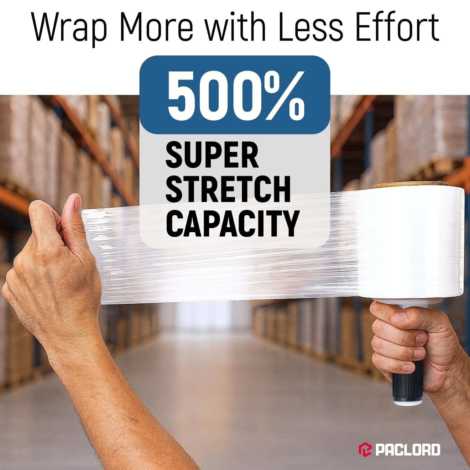 Industrial Strength 80-Gauge Stretch Wrap: Paclord shrink wrap roll measures a compact 5 inches wide by 1000 feet long and includes one perfectly fitting plastic handle for precision wrapping. Durable 80-gauge clear plastic wrap will withstand sharp edges, heavy loads, and demanding warehouse conditions without tearing