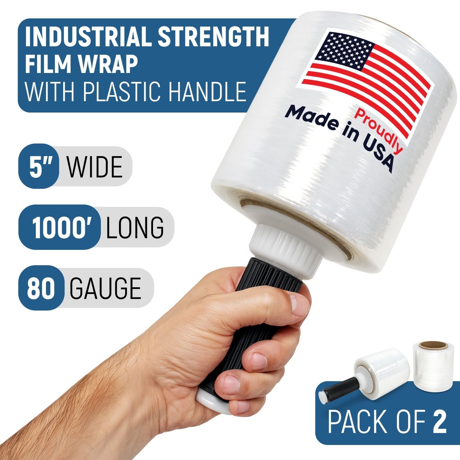 5″ x 1000’ Industrial Strength Stretch Wrap, Ready to Use Pack of 2 Mini Rolls with one Handle, Clear Plastic Film, 80 Gauge Thick, 500% Elongation – Heavy-Duty Shrink Wrap for Moving, Packing