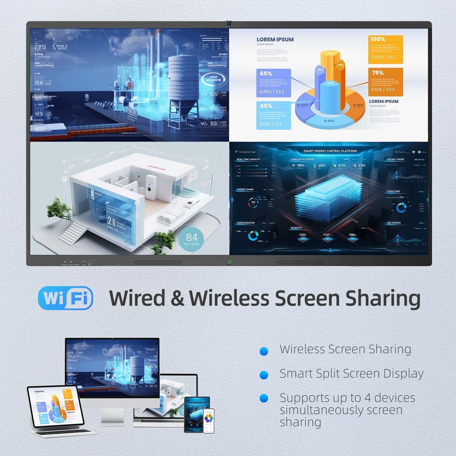【Wired & Wireless Screen Sharing】Share content instantly from any device. The MWE-QIXZOCV Interactive Whiteboard supports versatile casting: wirelessly mirror smartphones, tablets, or laptops via Miracast/AirPlay, or connect via HDMI/USB-C for a solid wired connection. Its powerful split-screen function lets you display content from up to 4 different sources simultaneously – perfect for comparing student work, analyzing multiple data sets, or collaborative presentations. Turn this Digital Whiteboard into the central hub for all your ideas.