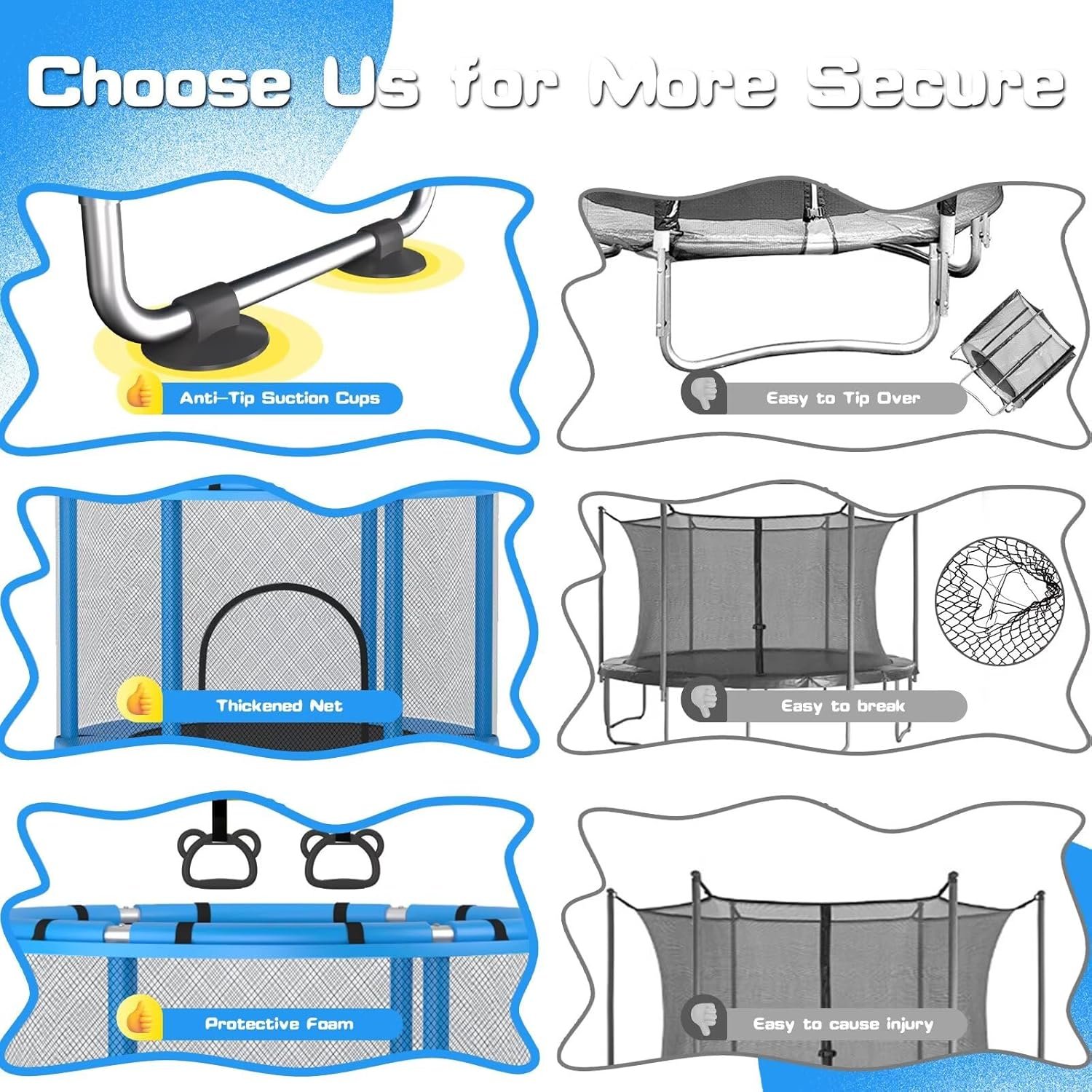 Safe & Sturdy – Indoor trampoline for kids is built to last, with a thickened steel frame, 3 U-shaped legs with non-slip suction pads, and a 360° wrap-around safety pad. Plus, with dense safety netting and upgraded foam, it’s a robust and secure space for your little ones to bounce and play.