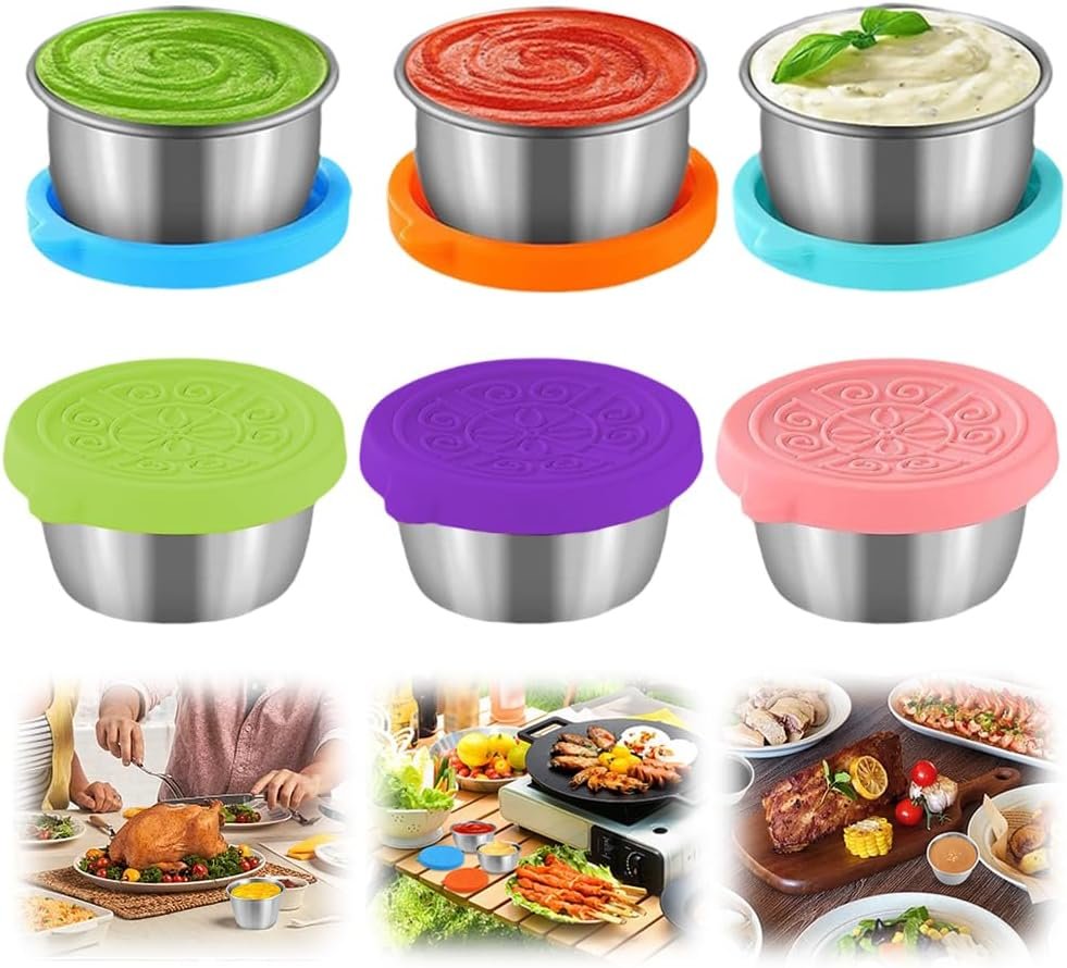 🥦【Stainless Steel Sauce Containers】There are two size to be provided. The size of this salad dressing container is 1.6 ounces/2.4 ounces, which is small and easy to carry. The sauce containers set can meet your various small-capacity and multi-variety needs.