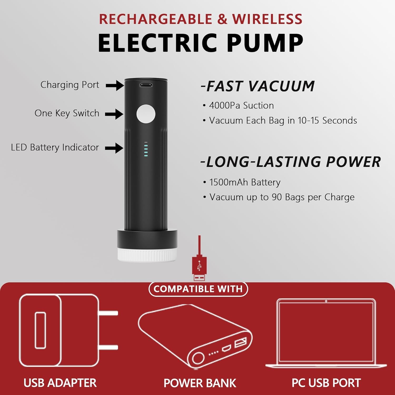 Rechargeable & Wireless Electric Pump: Effortlessly enhance your packing and storage efficiency with our state-of-the-art wireless electric pump. Powered by a 1500mAh battery, it allows up to 90 vacuum sealing per charge. With 4000Pa suction, it can compress a bag in 10-15 seconds.