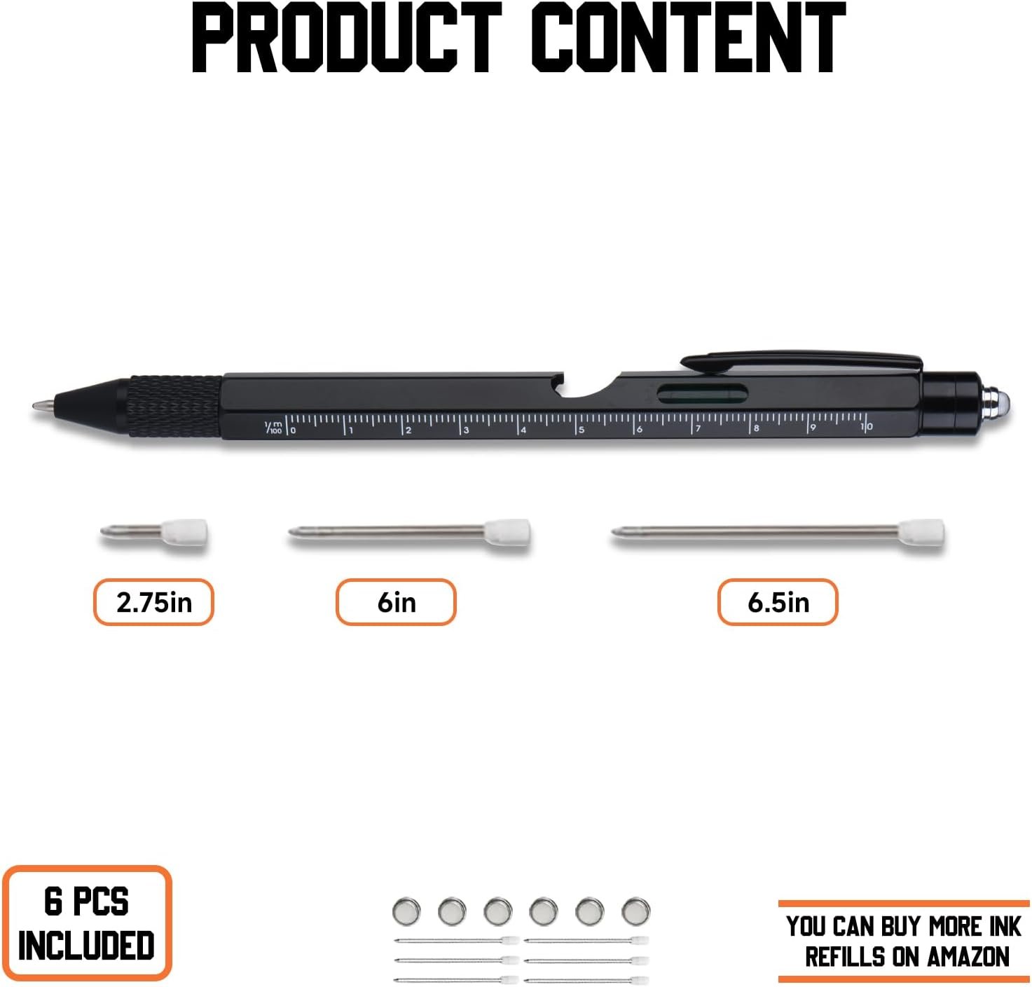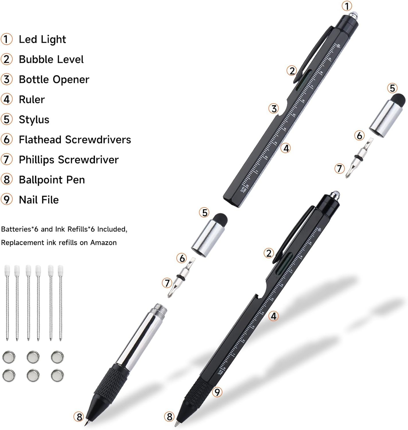 Multitool Pen Set gifts for Men (2-Piece): Features our 2025 upgraded black steel 9-in-1 pen and silver aluminum 6-in-1 pen. This premium set includes a personalized gift box, plus 3 spare batteries and 6 black ink refills. Experience exceptional versatility with 9 integrated functions: rotating ballpoint pen, stylus, bubble level, metric/standard ruler, flat/Phillips screwdriver, LED flashlight, bottle opener and nail file.