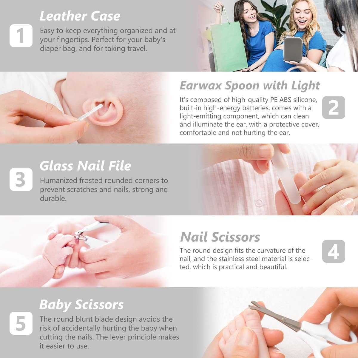 HIGH-QUALITY PRODUCTS – Registry Must Have! Scissors with round blades, combs with round teeth and soft brushes, ear cleaner with LED lights to ensure safe visibility, gentle silicone toothbrushes suitable for sensitive gums, nasal suction devices that can easily clean nasal dirt, etc., provide the best daily care for your baby in all directions.