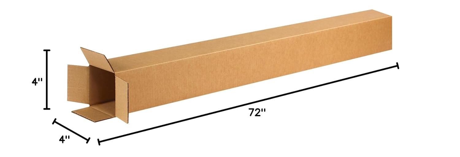 4 x 4 x 72″ Tall Corrugated Boxes. Tall Corrugated Boxes are end loading for easy insertion and sealing. May be used in place of mailing tubes. Ideal for shipping irregularly-shaped items, such as lamps, golf clubs, shelving, fishing rods and umbrellas. Boxes are manufactured from 200#/ECT-32 kraft corrugated. Corrugated boxes are reusable and recyclable. Cartons are sold in bundle quantities and ship flat to save on storage space and shipping. Proudly made in the USA