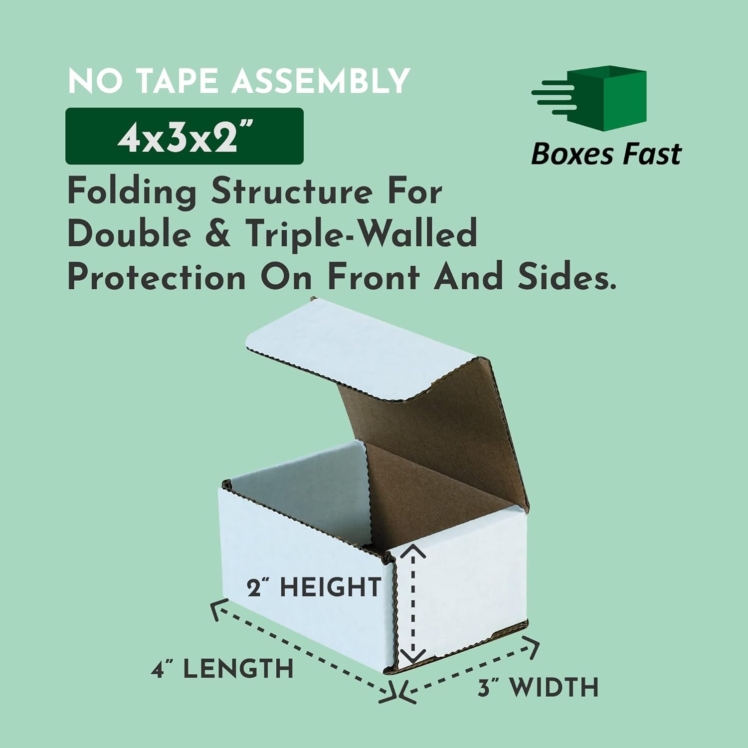4 x 3 x 2″ White Corrugated Mailers. Corrugated Mailers are super strong yet light-weight to save on postage. Perfect for shipping small, light-weight fragile items. Corrugated Mailers are manufactured from 200#/ECT-32-B white corrugated. Crush resistant mailers fold to provide double walls of protection on front and sides. No tape, glue or staples needed. Proudly made in the USA!