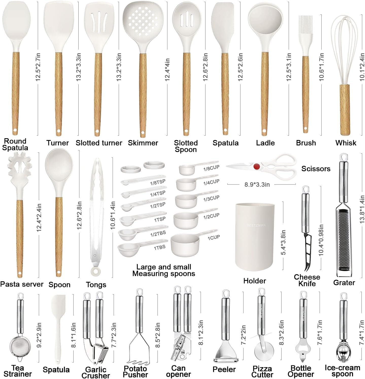 35 COOKING UTENSILS – Utensil Set includes everything you need to cook that perfect dish,includes Slotted Spatula ,Slotted Spoon,Flexible Spatula,Slotted Turner, Solid Turner, Pasta Server,Solid Spoon, Kitchen Tongs, Draining Spoon, Whisk ,Deep Soup Ladle,Spatulas,Brush,Peeler,Pizza Cutter,Bottle Opener,Potato,Pusher,Ice-cream spoon,Can opener,Grater,Scissors,measuring cups and spoons set,Hooks,Tea strainer,Garlic crusher,Cheese knife,Spatula,Holder