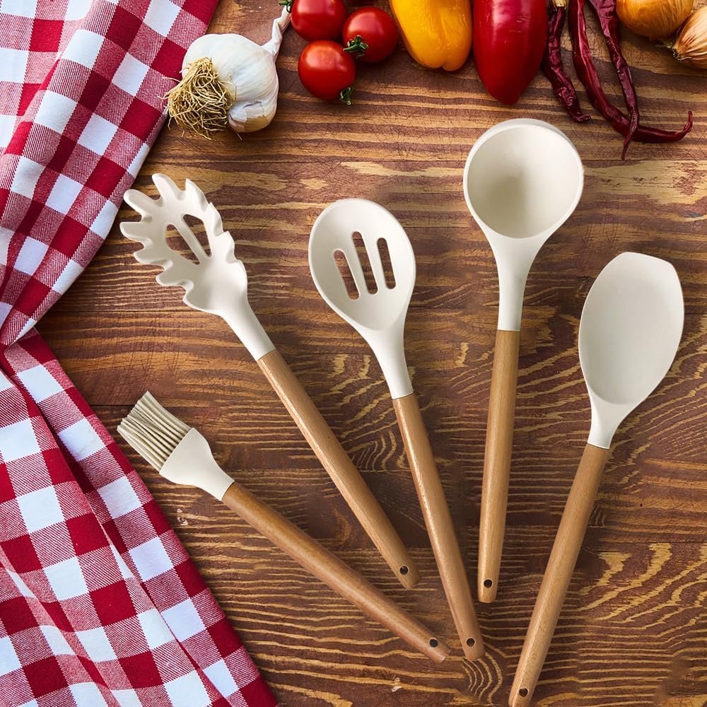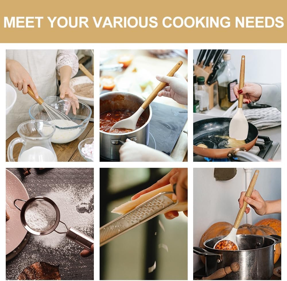 THE WOODEN HANDLE IS ANTI-SCALDING.THE SILICONE SOFT AND DOES NOT HURT THE POT – This kitchen utensil handle is made of solid wood. Smooth and comfortable to the touch, it completely prevents the heat transfer during the cooking process. Avoid scalding the chef’s hands. Deep Soup Ladle, Solid Serving Spoon, Slotted Spoon, Flexible Spatula, Round Spatula, Pasta Server, Slotted Turner, etc. are made from food grade silicone. No warping, soft, completely protect your pot from being scratched.