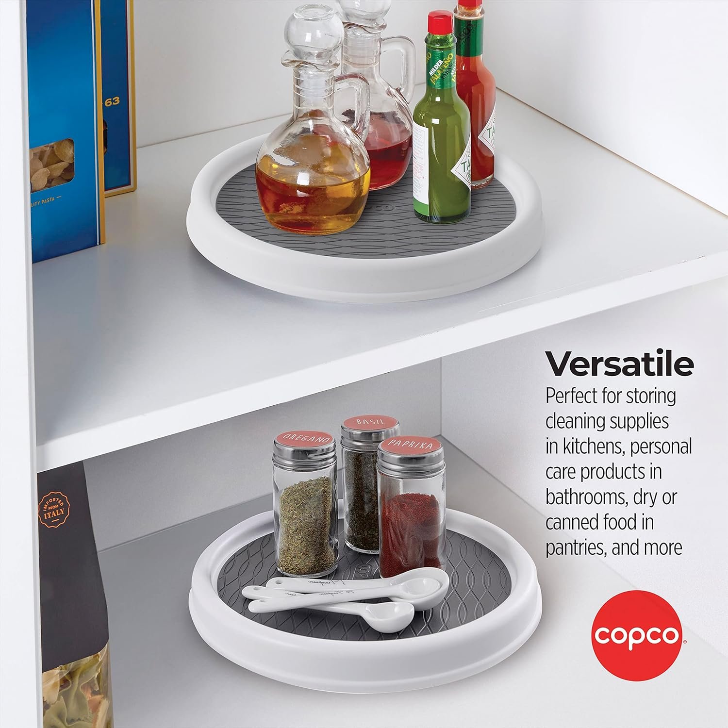 This Capcom set of 2 turntables will make a great addition to your kitchen. This set includes two 9 inch turntables with non-skid liners. Use on countertops, tables or in cabinets. Rotates for convenient access to items maximizing cabinet space and keeps kitchens organized and tidy. Outer rim prevents items from falling off, non-skid surface keeps items in place while rotating. Wipe clean with a damp cloth.