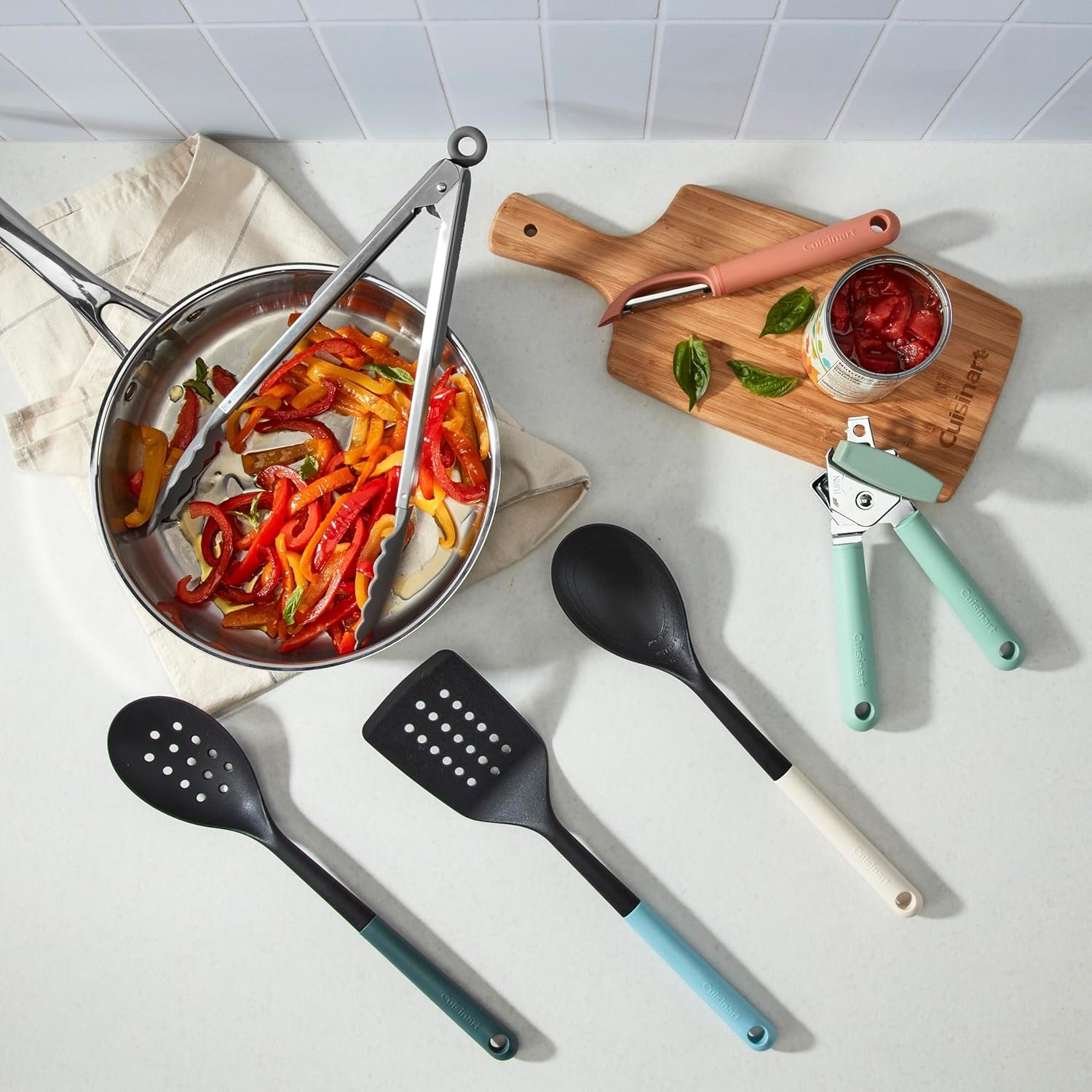 This colorful Cuisinart® Green Gourmet(R) Complete(TM) tool set combines practicality, style and eco-conciousness with handles that are crafted from 90% post-consumer recycled plastic bottles. Tool heads are made of nonstick safe nylon and gadgets are made from from durable stainless steel. Each distinct color handle prevents cross-contamination and also makes it easy to identify utensils at a glance. From peeling, tossing, turning, and stirring, this collection ensures both functionality and aesthetics. This set includes a solid spoon, slotted spoon, slotted turner, 12″ nylon tongs, peeler, and can opener.