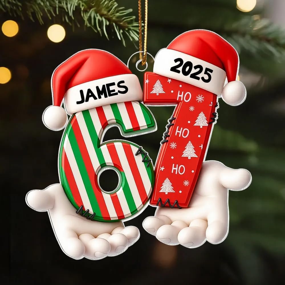 🎅 PERSONALIZED 2025 VIRAL TREND ORNAMENT: Customize with any name and year on Santa hat featuring adorable “67” numbers held by fluffy Santa hands – Festive candy cane striped “6” and red “Ho Ho Ho” Christmas tree pattern “7” design that captures the trending Year of Six Seven meme