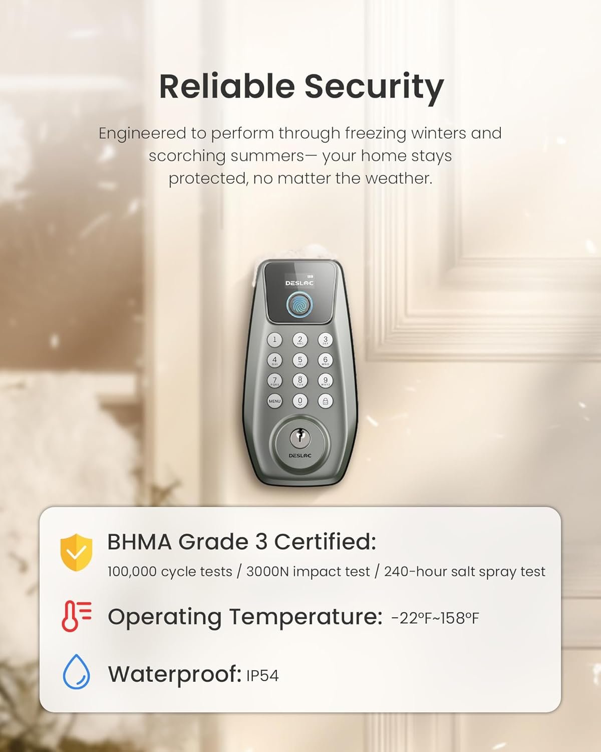 ๐๐ซ๐๐ฆ๐ข๐ฎ๐ฆ ๐๐๐๐ฎ๐ซ๐ข๐ญ๐ฒ & ๐๐ซ๐ข๐ฏ๐๐๐ฒ: This front door smart lock complies with BHMA 3 standards, featuring a robust lock cylinder, IP54 weather resistance, anti-peep PIN protection, and an auto-lock function.Your data is securely stored locally to minimize risks of duplication and remote cyber attacks