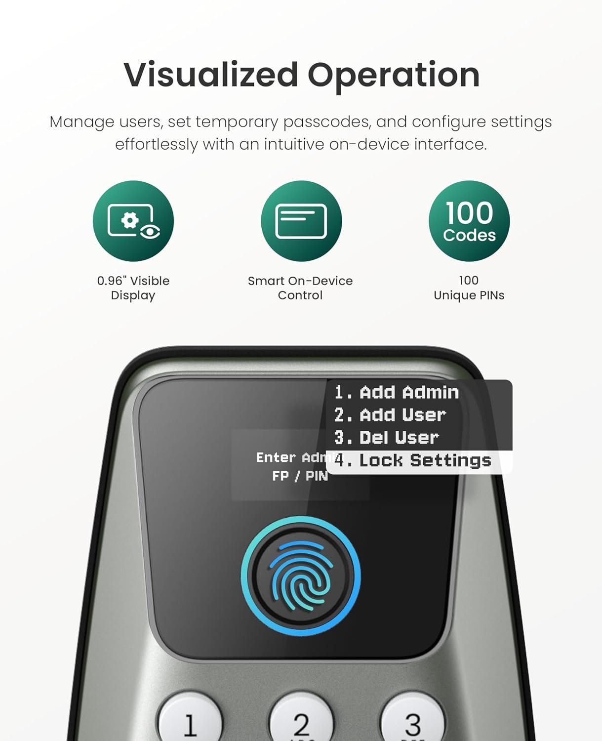 ๐๐จ๐๐ค๐๐ฎ๐ ๐๐ฆ๐๐ซ๐ญ ๐๐ข๐ฌ๐ฉ๐ฅ๐๐ฒ:Manage settings, create passcodes, add users, and view system alerts directly on the built-in LockVue display. No app or Wi-Fi required โ a smart lock with clear visual guidance that eliminates setup confusion and programming errors.