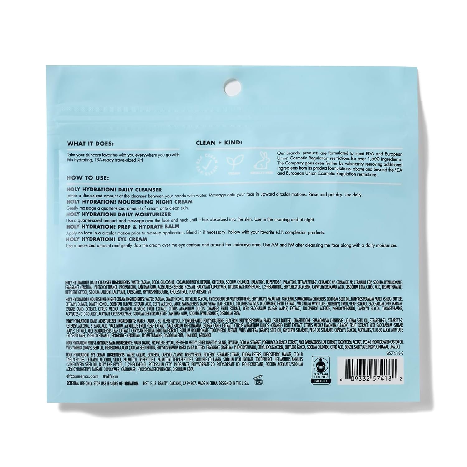What it is: Five hydrating skincare favorites packed in one travel-sized kit. Why we love: A complete skincare routine in one kit TSA-friendly sizes Moisturizing, vitamin-infused formulas Key Ingredients: Citric Acid – Gently exfoliates and evens skin tone Cucumber Extract – Calms skin and reduces puffiness Shea Butter – Nourishes and softens skin Aloe Vera – Soothes and provides anti-inflammatory benefits Jojoba Oil – Locks in moisture Vitamin E – Brings a refreshing moisture boost A skincare routine that’s ready to go where you are! This convenient travel-sized kit includes five moisturizing skincare faves that will deeply nourish, brighten, and soothe all skin types. Each product packs a punch and is infused with skin-quenching ingredients that will hydrate your skin from the inside out. Kit includes: Daily Face Cleanser (30ml) – A gentle daily cleanser infused with Citric Acid that removes dirt, impurities, and makeup while brightening skin. Prep and Hydrate Balm (6g) – A water-based balm stick that instantly hydrates, improves skin texture, and preps skin for makeup application. Daily Hydration Moisturizer (25 ml) – A lightweight cream moisturizer infused with essential nutrients to deeply nourish the skin. Nourishing Night Cream (15g) – A soothing and calming cream that revitalizes the skin overnight. Illuminating Eye Cream (7g) – A rich and nourishing eye cream that reawakens your delicate eye area. All e.l.f. products are made from skin-loving ingredients you want, minus the toxins you don’t—all at good-for-you prices. All e.l.f. products are 100% vegan, cruelty-free, and leaping bunny certified. Because kindness is chic. “