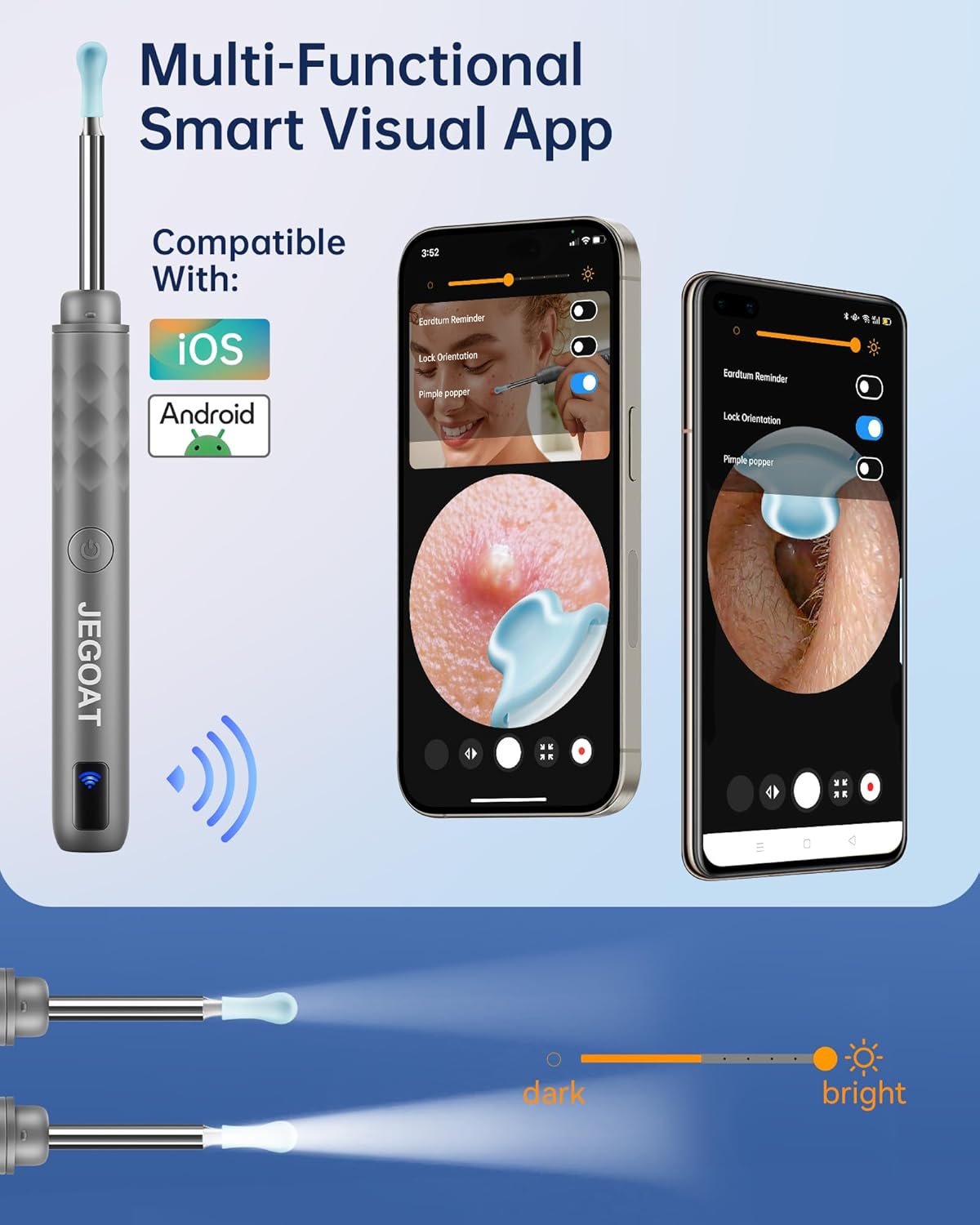 Smart App Connection – Works with iOS/Android via WiFi/Bluetooth. Real-time ear imaging for precise cleaning; capture photos/videos to track ear health or share easily—simple and practical