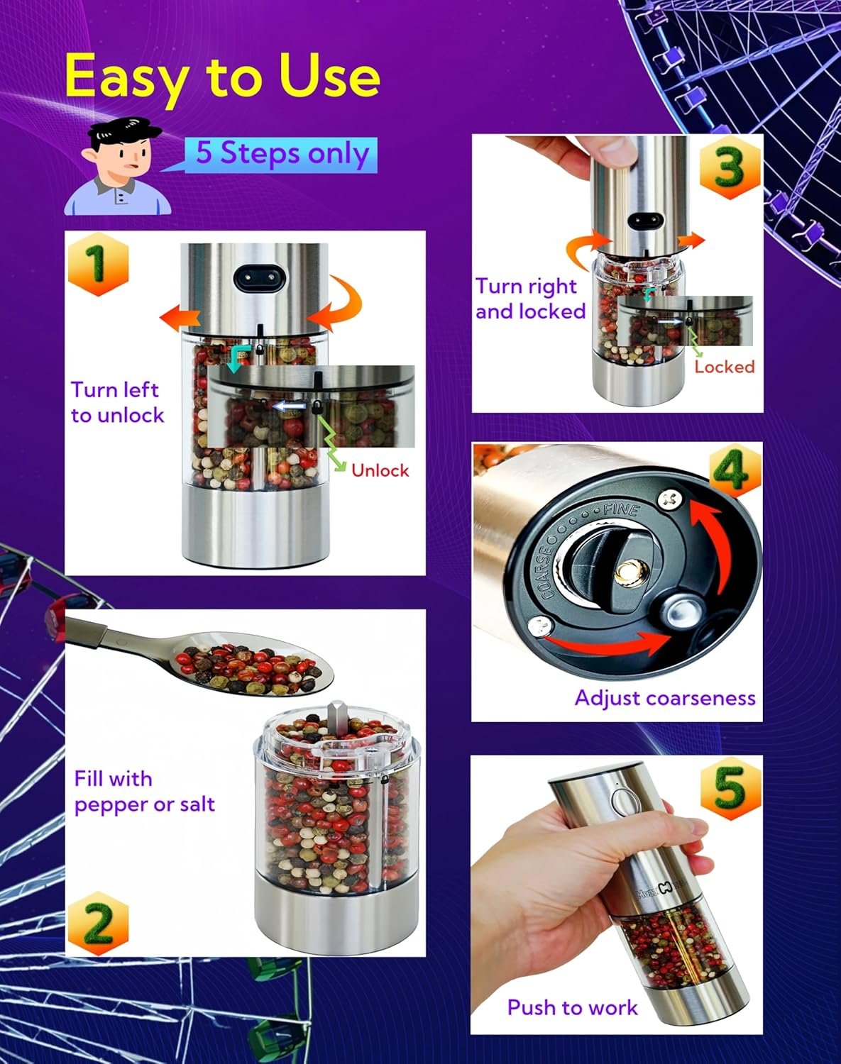 BUILT-IN LED LIGHTING: The salt and pepper grinders are equipped with a Led lights that light up immediately when you grinding, so you can see clearly to making it easy to add just the right amount of salt and pepper to your dishes.