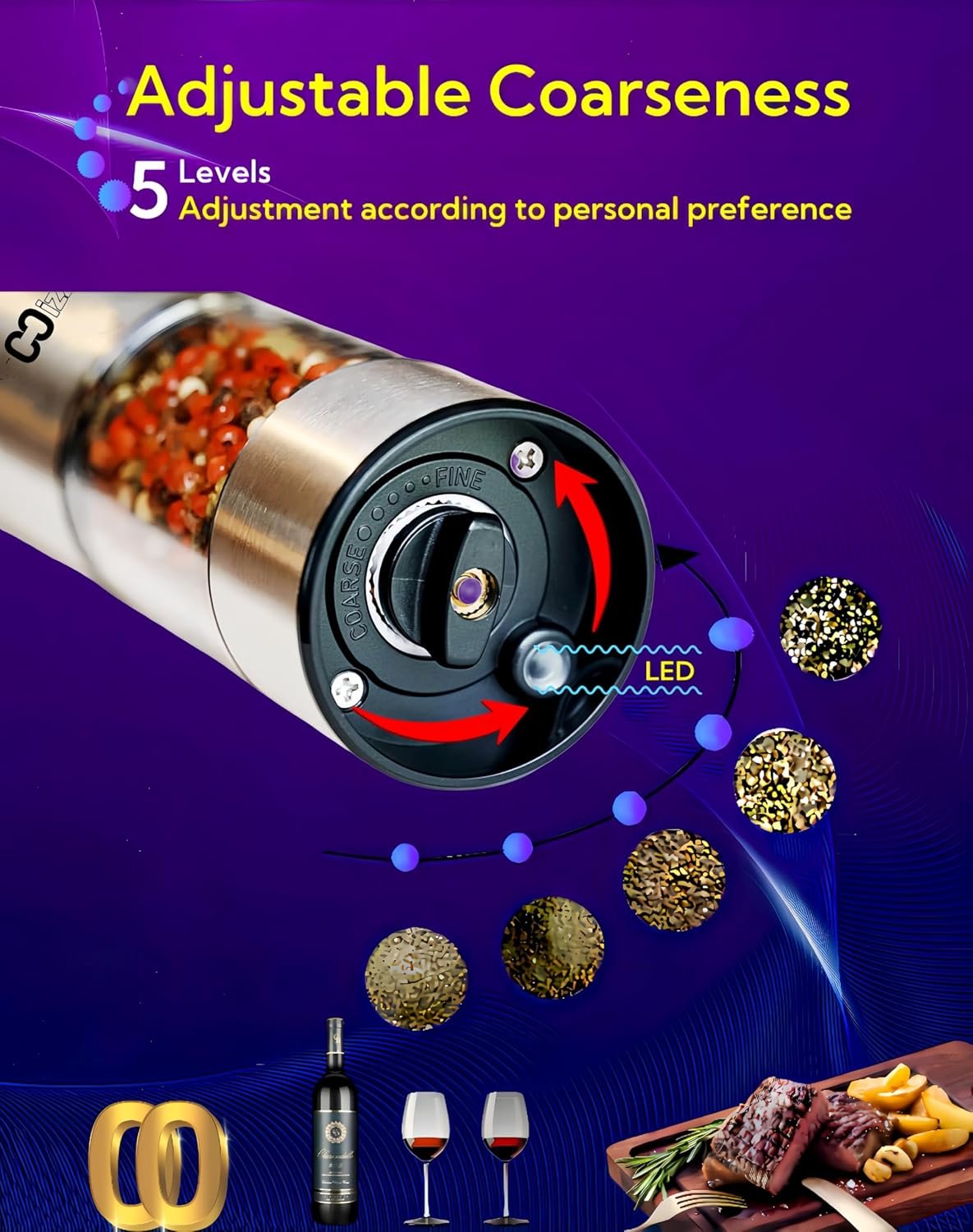 5-LEVEL ADJUSTABLE COARSENESS: This electric salt and pepper grinder can meet your grinding needs. Easily adjust the core to achieve the perfect coarseness for grinding salt, pepper, or any other seasoning of your choice, and the heavy-duty ceramic rotor will absolutely help you retain the original flavor of the spices.