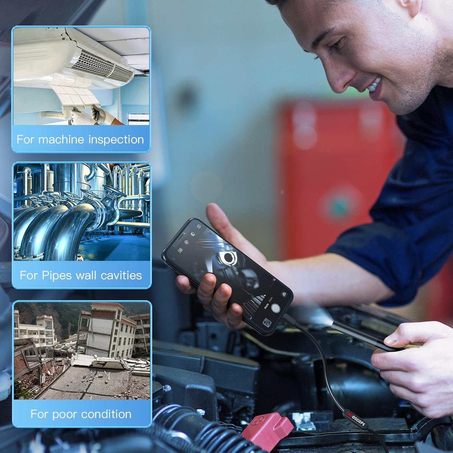 Multipurpose Gadget for Every Task: Endoscope is suitable for various scenes, such as inside the car or around the engine, inside the pipe inspection, or the house inspection mold, and wiring.Built-in 6 LED lights with adjustable brightness, this pipe camera can also capture the best images even in the dim areas