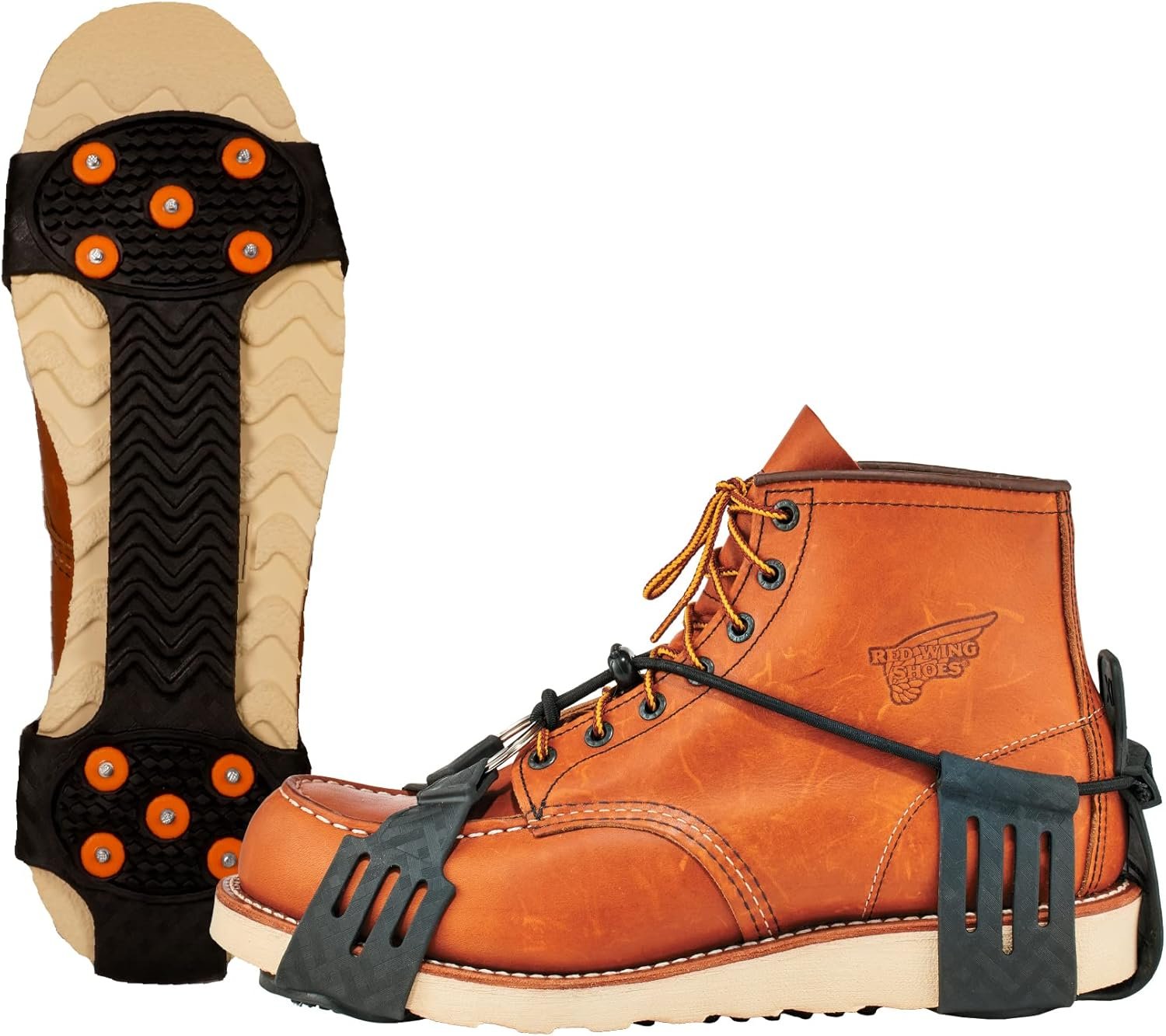 FULL FOOT ICE TRACTION – 10 rugged, heat-treated carbon steel studs line the foot with a thicker under-sole tread connecting the mid-foot and heel stud zones for extra traction