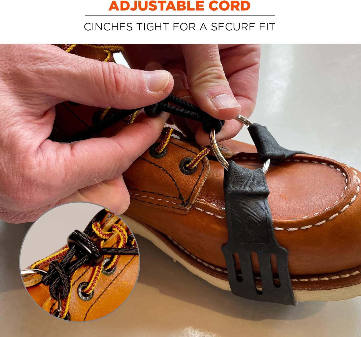 The TREX 6310 Adjustable Slip-On Ice Cleats are lightweight ice grips for boots and shoes that provide tenacious traction and extra stability on ice and snow. Stretchable one-piece design offers grip to prevent slip and fall injuries on the ice. These ice grippers feature 10 rugged carbon steel cleats on the ball and heel of foot for grip on slippery terrain. Aggressive trade connects mid-foot and heel stud zones for extra traction. Available in multiple sizes and will fit over any style of boot or shoe for traction and stability during winter work or other winter outdoor activities. Tested to be flexible in temperatures down to -40°F (-40°C), the stretchable rubber material provides a secure fit and easy slip-on/off wear. An adjustable cord cinches tight for a secure fit. Reflective pull-on tab on these ice traction cleats adds enhanced visibility. These snow cleats are lightweight and can be folded small enough to be stored in a pocket or pack when not being worn.