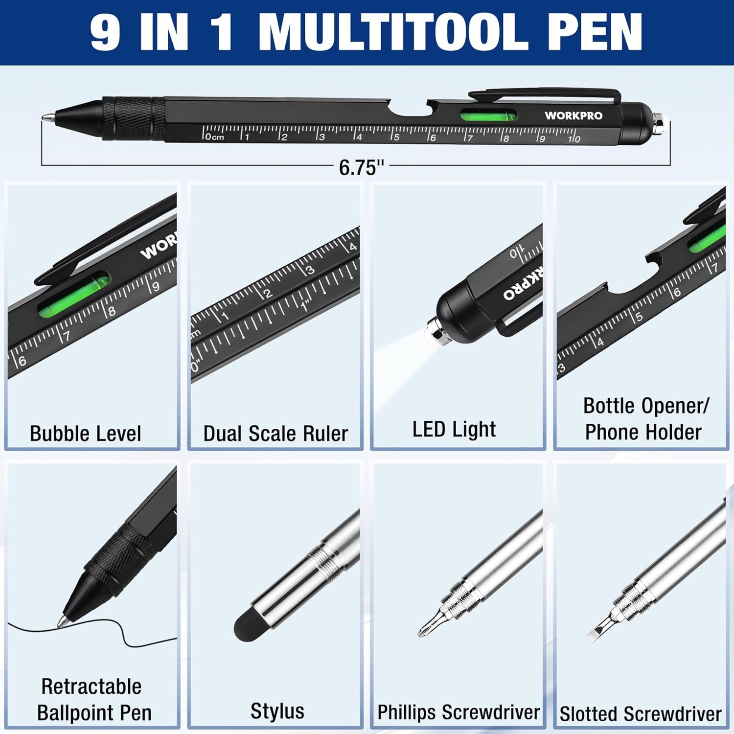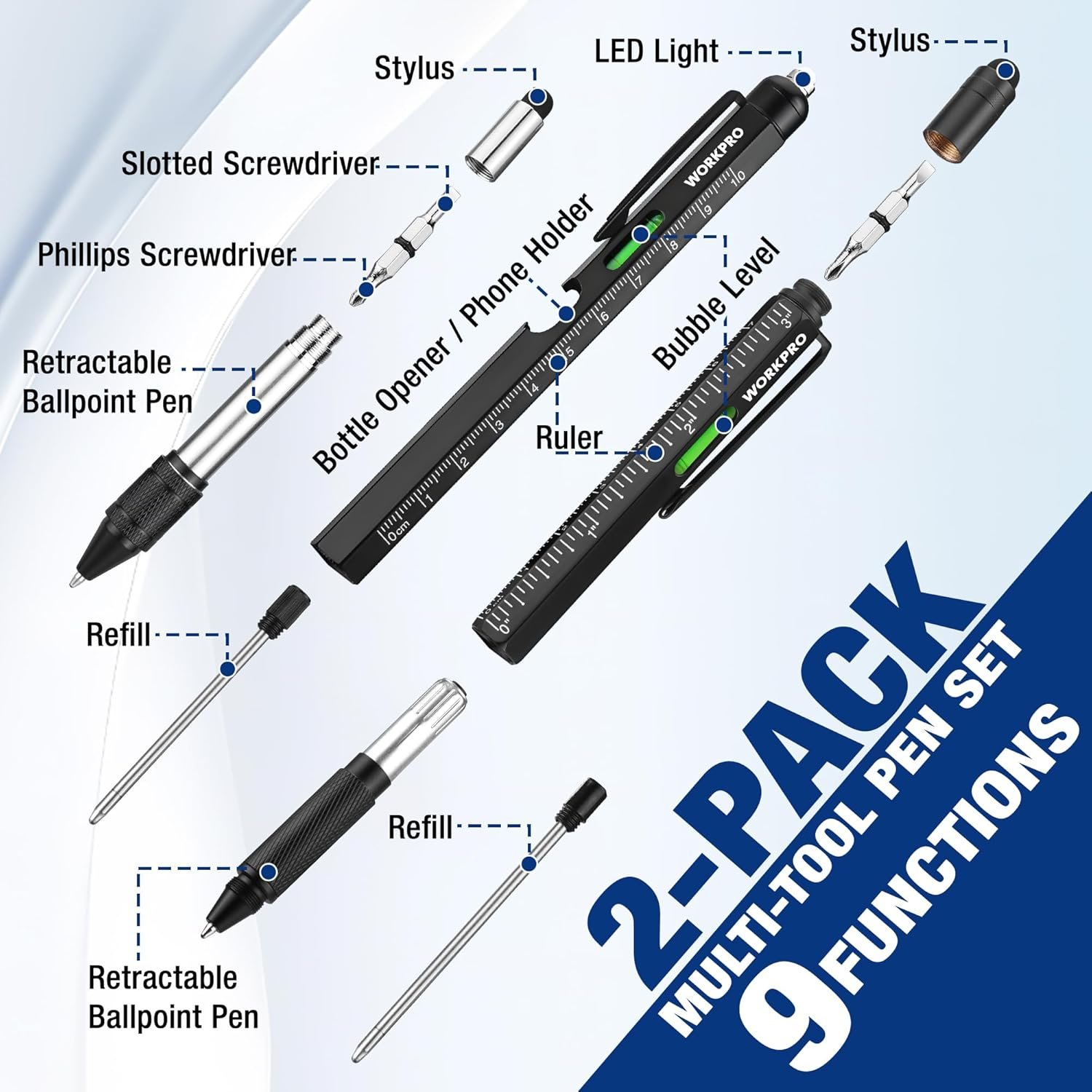 2-Pack Upgraded Multi-Tool Pens (9-in-1 & 6-in-1) : This 2025 upgraded multifunction pen set includes a rugged black steel 9-in-1 tool pen and a 6-in-1 pen. Features include twist ballpoint pen, stylus, LED flashlight, level, rulers (metric/inch), Phillips & flathead screwdrivers, and a bottle opener – everything packed into a pocket-sized tool.