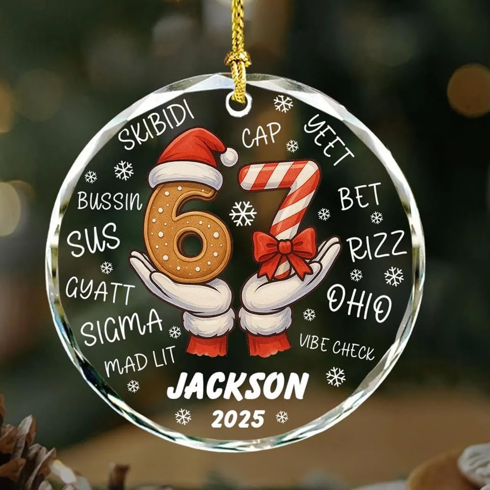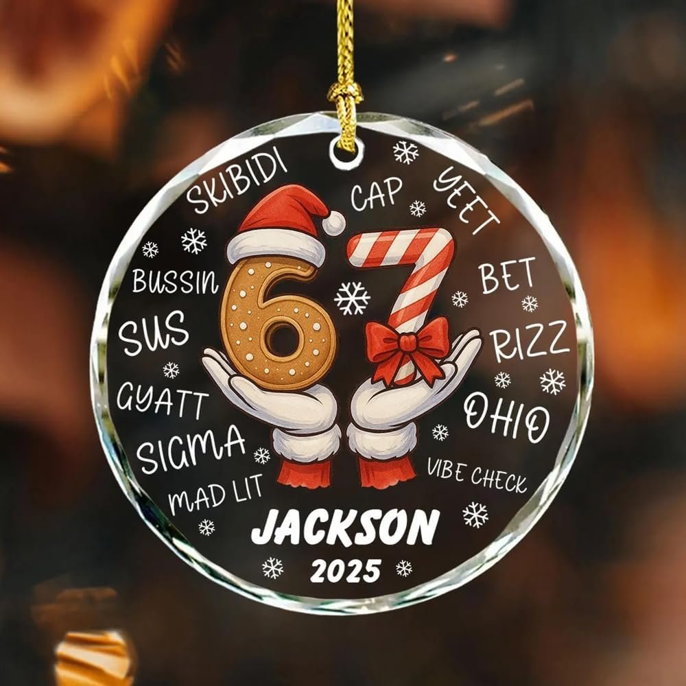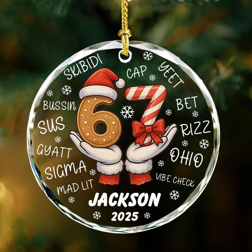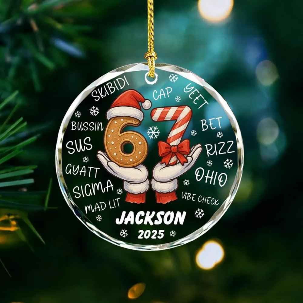 Funny Six Seven Glass Ornament Christmas 2025, Personalized 67 Meme Ornament, Viral Humor Ornaments Gift for Family Friends, Trendy 67
