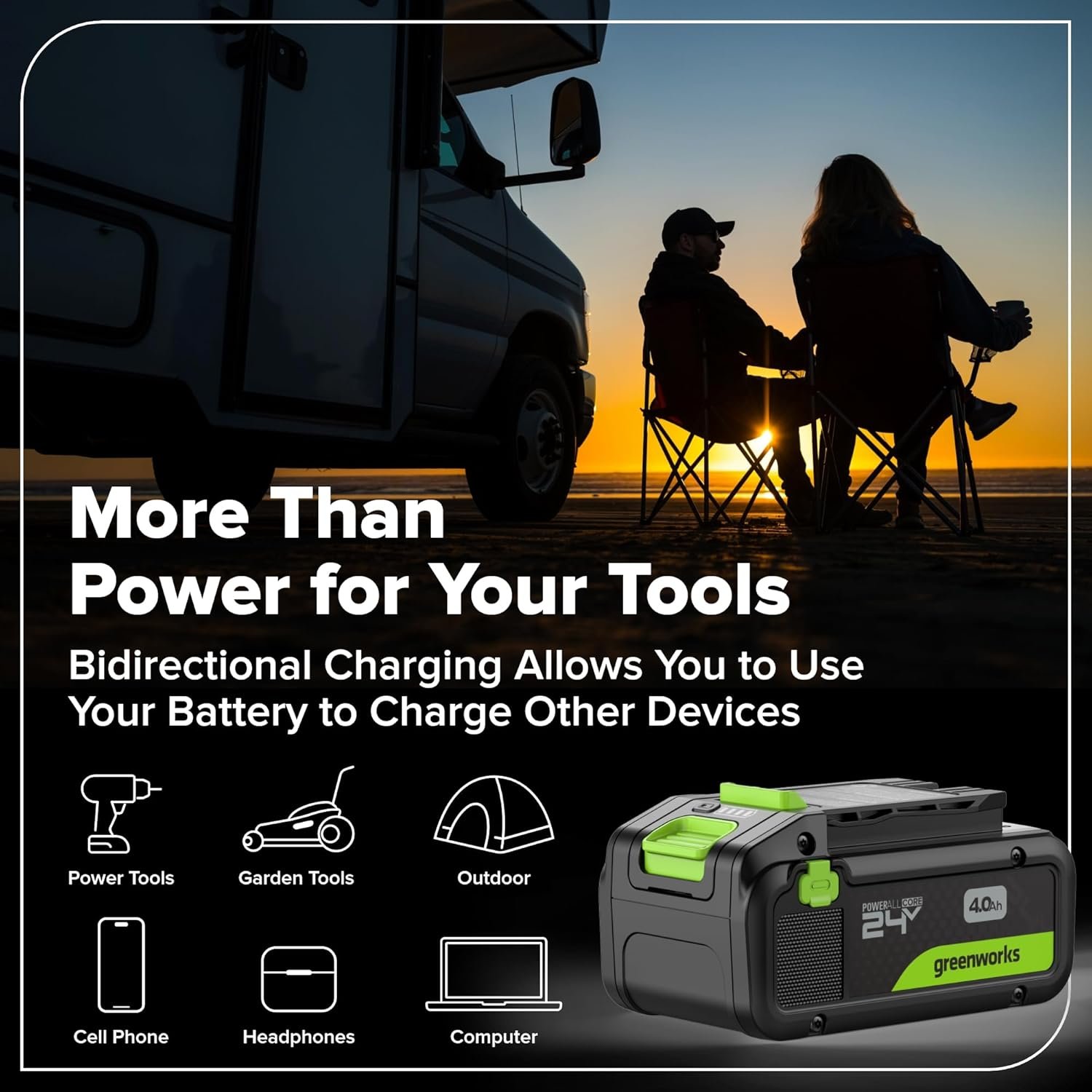 The Ultimate Dual-Power Battery & 65W Super Charger. This isn’t just a tool battery—it’s your all-in-one power solution. Experience 20% more power and 35% longer runtime for your Greenworks 24V tools, with fade-free performance. Then, unplug it and it becomes a 24,000mAh superpowered charger. With 65W High-Speed Two-Way USB-C, it can fast-charge a MacBook Pro, simultaneously top up your iPhone and Galaxy, or efficiently power three devices at once. It’s the unparalleled portable power source for your workshop, job site, and adventures.