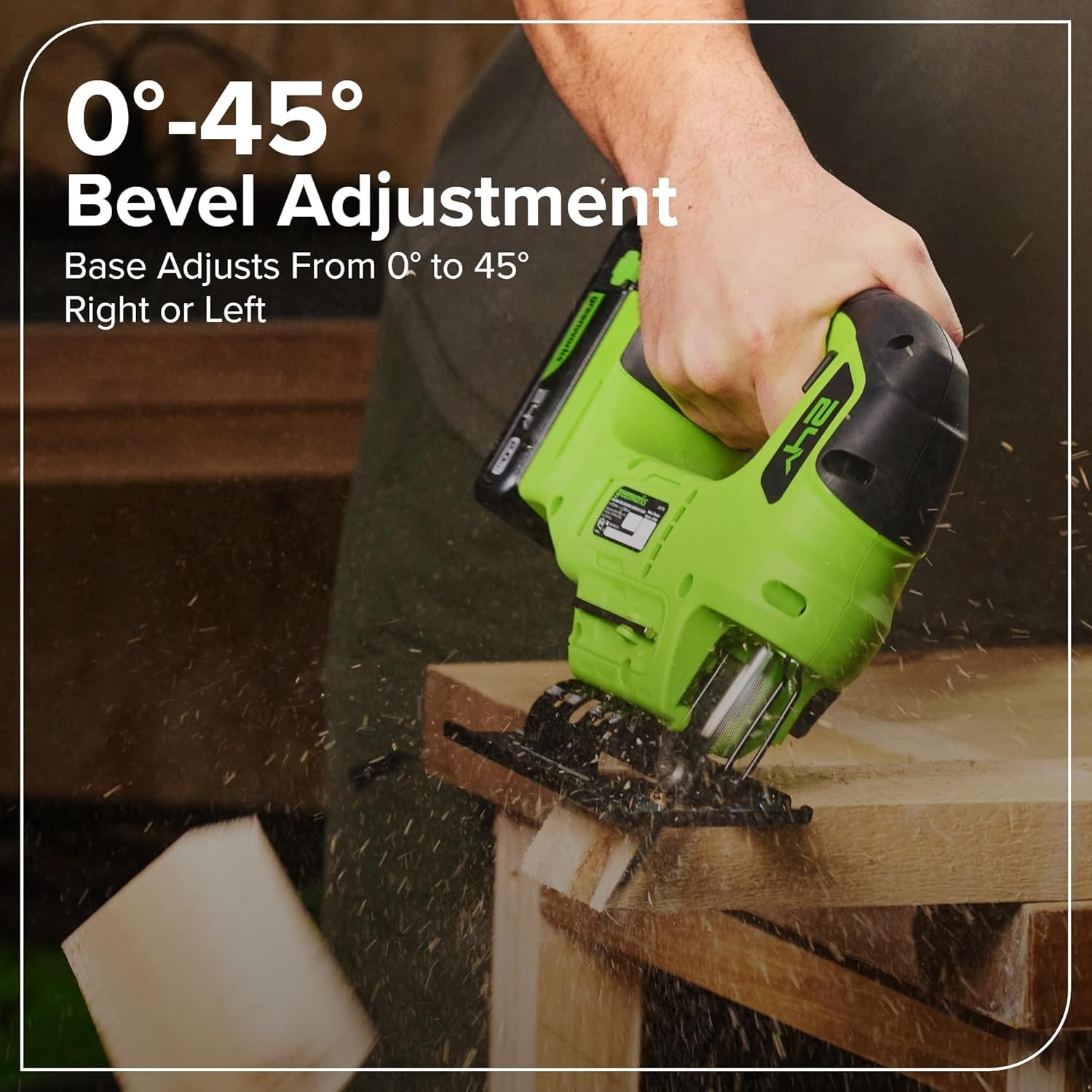 Brushless Cordless 1″ Jig Saw:Variable Speed Trigger (0-3000 SPM): Provides control for accurate and clean cuts in different applications. 1″ Blade stroke for cutting wood, metal and more materials.4 Orbital Setting: Adjusts cutting speed and aggressiveness for wide use of the jig saw. Shoe bevel with detents at 0°, 15°, 30° and 45°(Right and left ) for easy adjustment.Tool-free Quick Clamp allows for easy blade change.