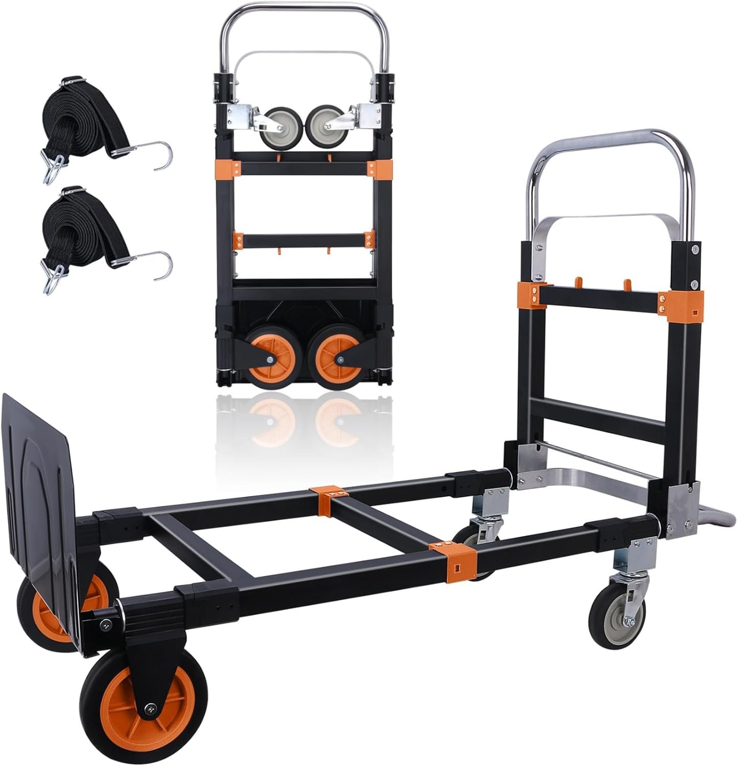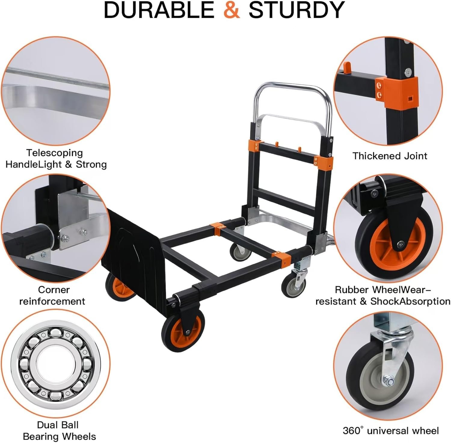 Heavy Duty Folding Hand Truck Dolly with 360° Universal Wheels, Black and Orange, Telescoping Handle, Dual Ball Bearing Wheels, Corner Reinforcement