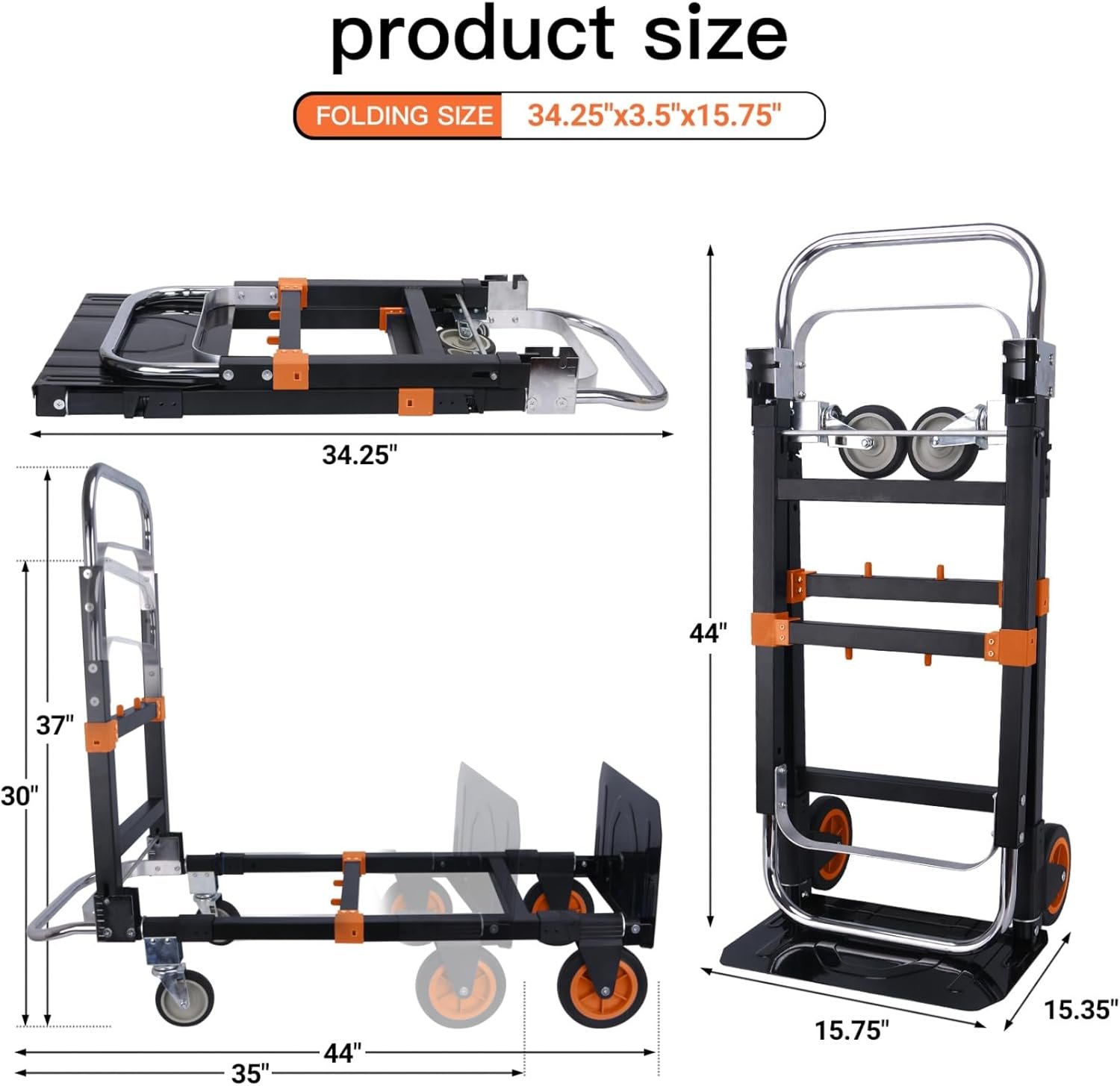 Transform your heavy lifting tasks with this robust folding hand truck dolly featuring innovative 360° universal wheels and dual ball bearing construction for superior maneuverability. The black and orange design combines functionality with durability, sporting a telescoping handle that adapts to your needs and thickened joints for enhanced stability. The dolly’s thoughtful engineering includes corner reinforcement and wear-resistant rubber wheels with shock absorption capabilities, ensuring reliable performance under demanding conditions. When fully extended, it measures 44 inches high with a 35-inch width, yet conveniently folds down to 34.25 x 3.5 x 15.75 inches for compact storage. The sturdy frame and reinforced construction make this hand truck an essential tool for moving heavy items, while its lightweight and strong design ensures easy handling. Perfect for warehouses, offices, or home use, this versatile dolly combines professional-grade durability with user-friendly features for efficient material handling.