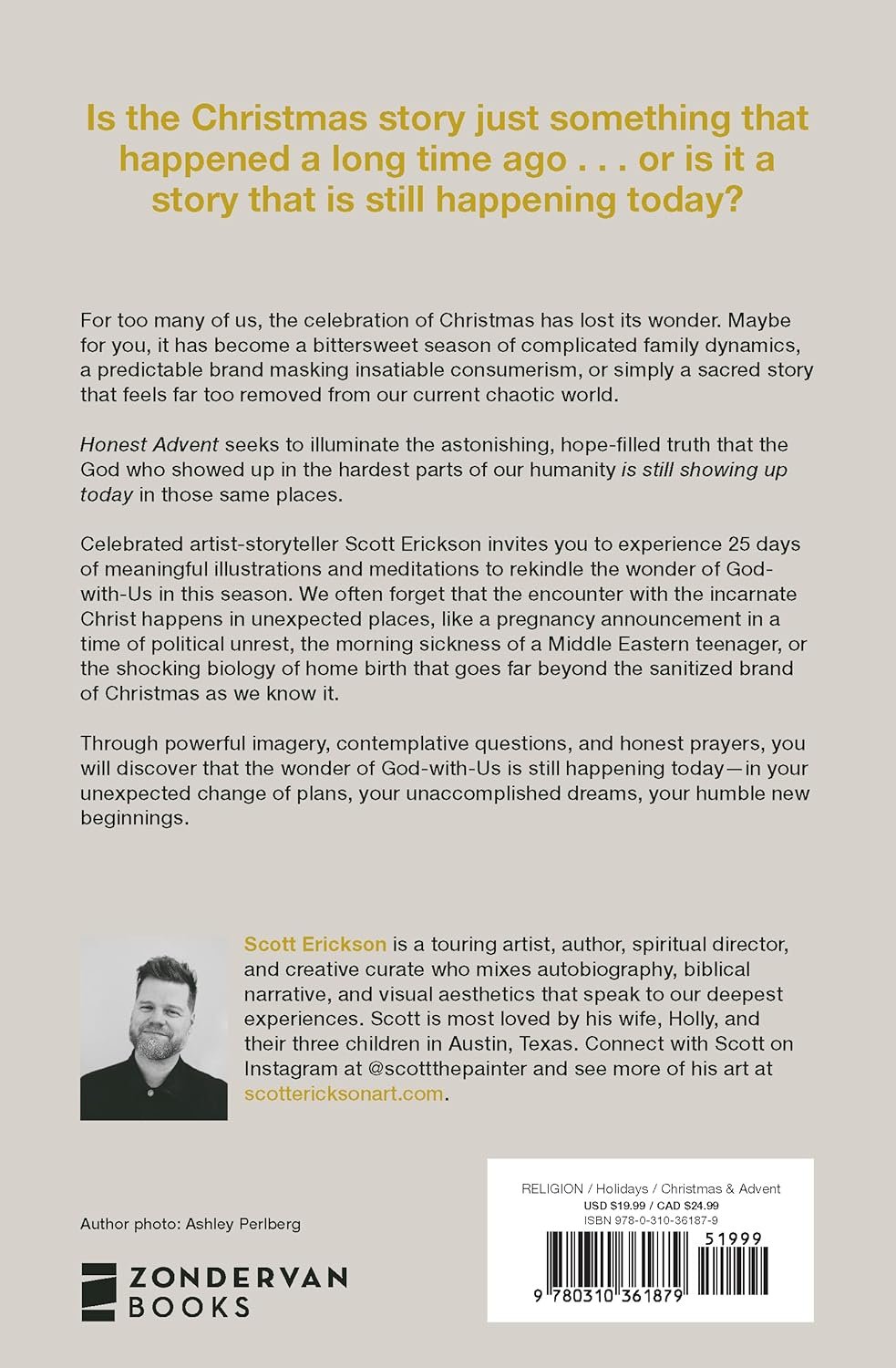 From celebrated artist and storyteller Scott Erickson comes Honest Advent, 25 days of illustrations and meditations that will help you rekindle the wonder of this season. Honest Advent creates a space for you to encounter the Incarnate Christ in unexpected places: like a pregnancy announcement in an era of political unrest and empirical bloodshed, the morning sickness of a Middle Eastern teenager, and the shocking biology of birth that goes far beyond the sanitized brand of Christmas as we know it today.