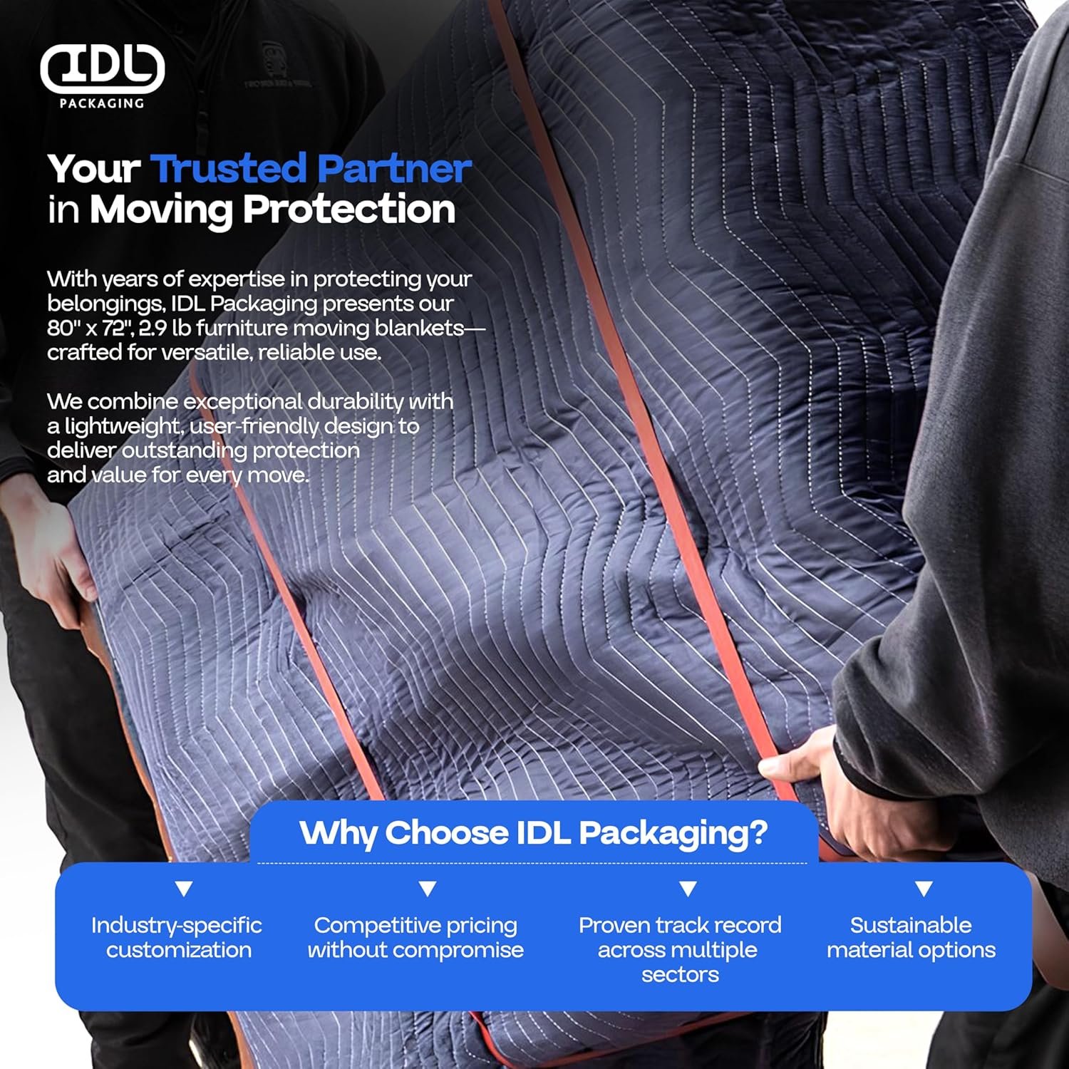 IDL Packaging Large Moving Blanket 80″ x 72″, Blue/Black Color – Heavy-Duty Furniture Pad for Moving & Wrapping – Thick Packing Blanket for Furniture Protection – Padded Mover Cover
