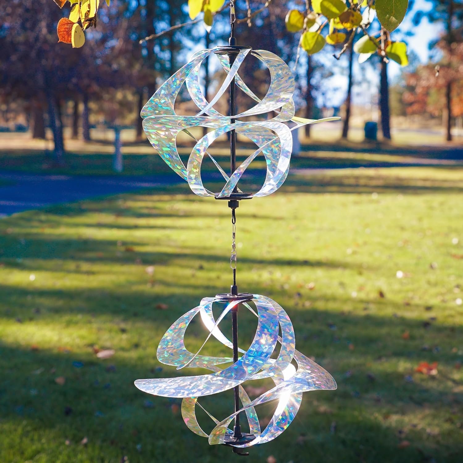 Bring a pop of sparkling fun to your yard or patio with the Silver Sparkle Double Vortex Spinner! These interconnected Mylar strips create a mesmerizing effect when it spins — your neighbors are sure to be jealous! With the connected loops on either end of the vortex section, you can easily add more vortices to your lineup, the only limit is your ground clearance! Be sure to check out the whole line up including the single vortex spinners available!