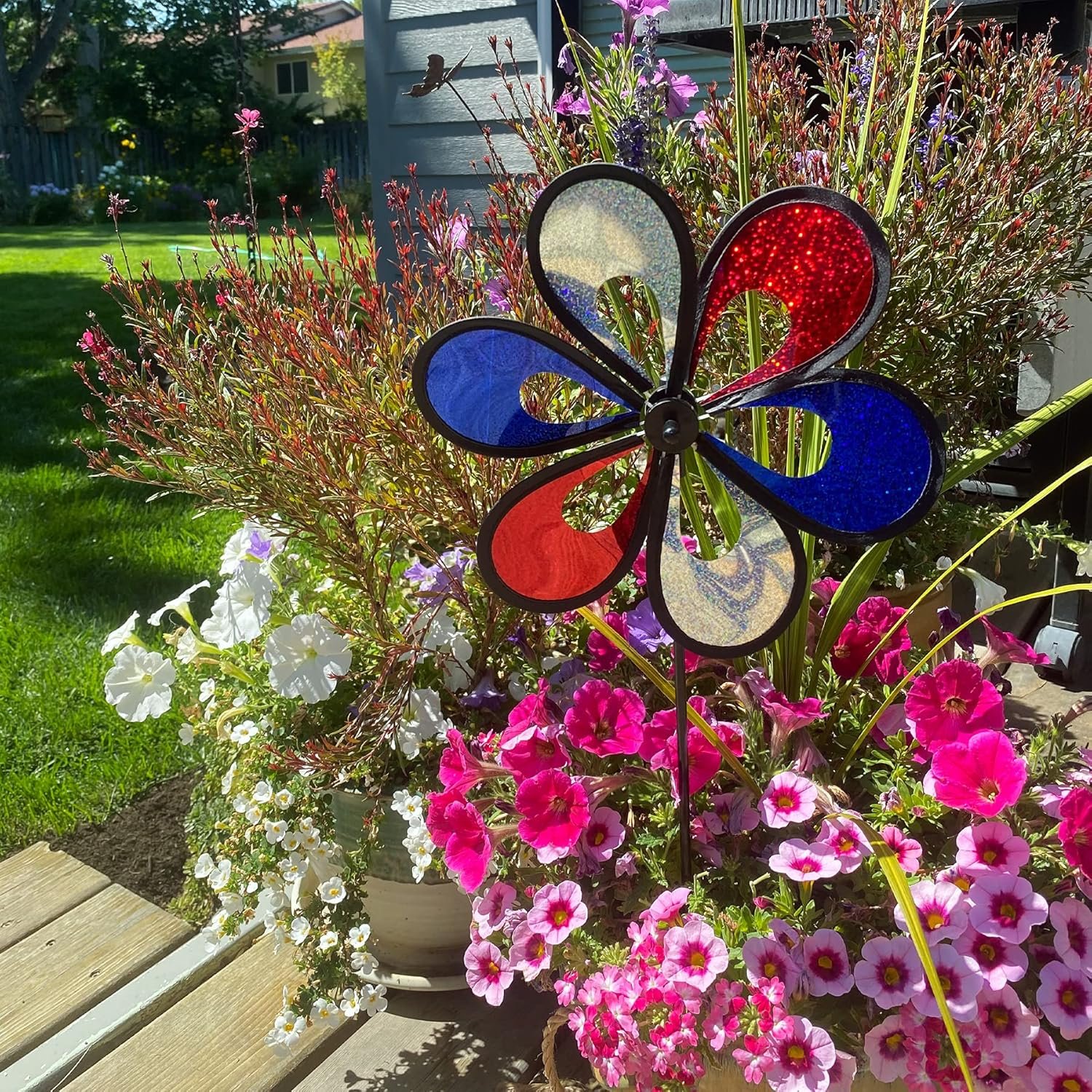 In the Breeze item #2669 – 10″ Red, White, and Blue Mylar Windee Wheelz Spinner. Add a BOLD SPLASH OF AMERICAN COLORS to your garden decorations!