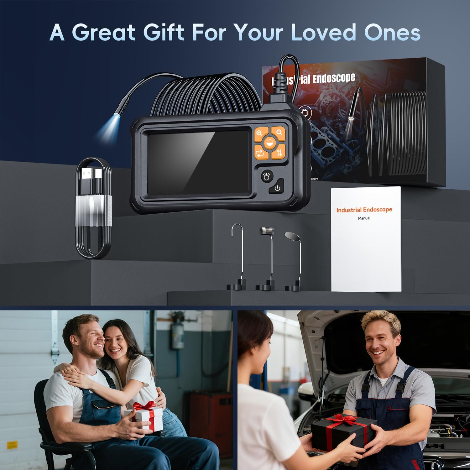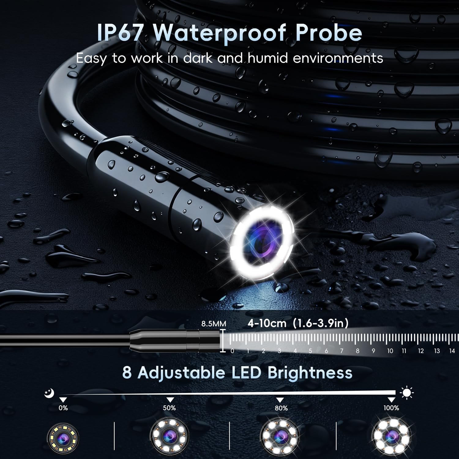 【Easy to Operate】Long press the power button to start and use it immediately; No need to use a mobile phone or download any software Snake Camera with Light: 8 adjustable LED lights to ensure a clear image even under dark conditions; Best focusing distance (2cm-10cm) making inspections easier; 5M (16.5feet) Semi-Rigid cable is both stiff and flexible to better meet your needs