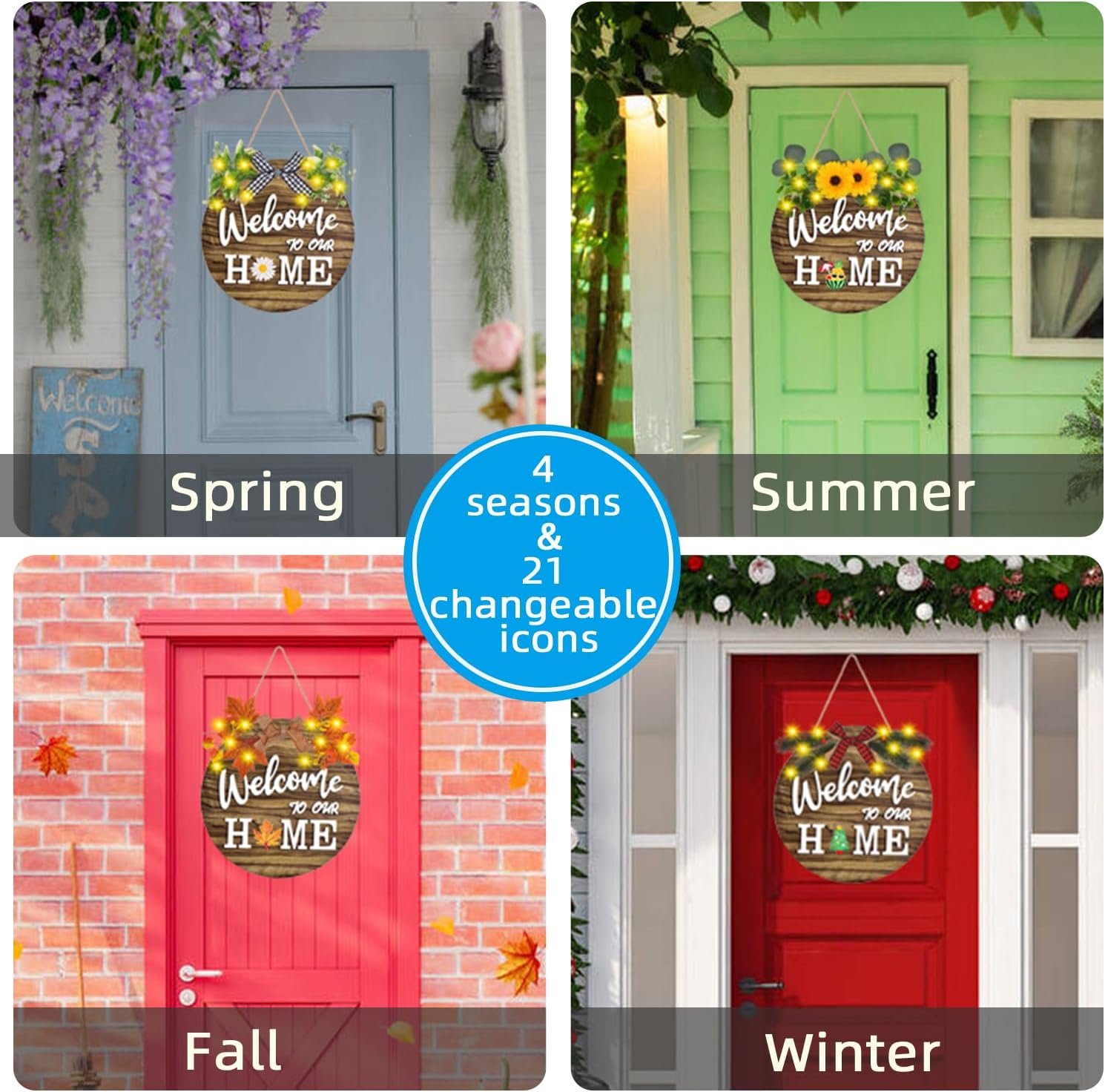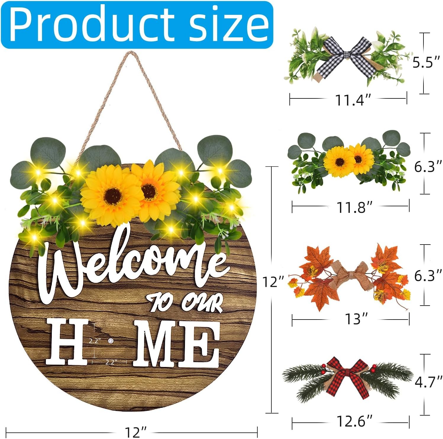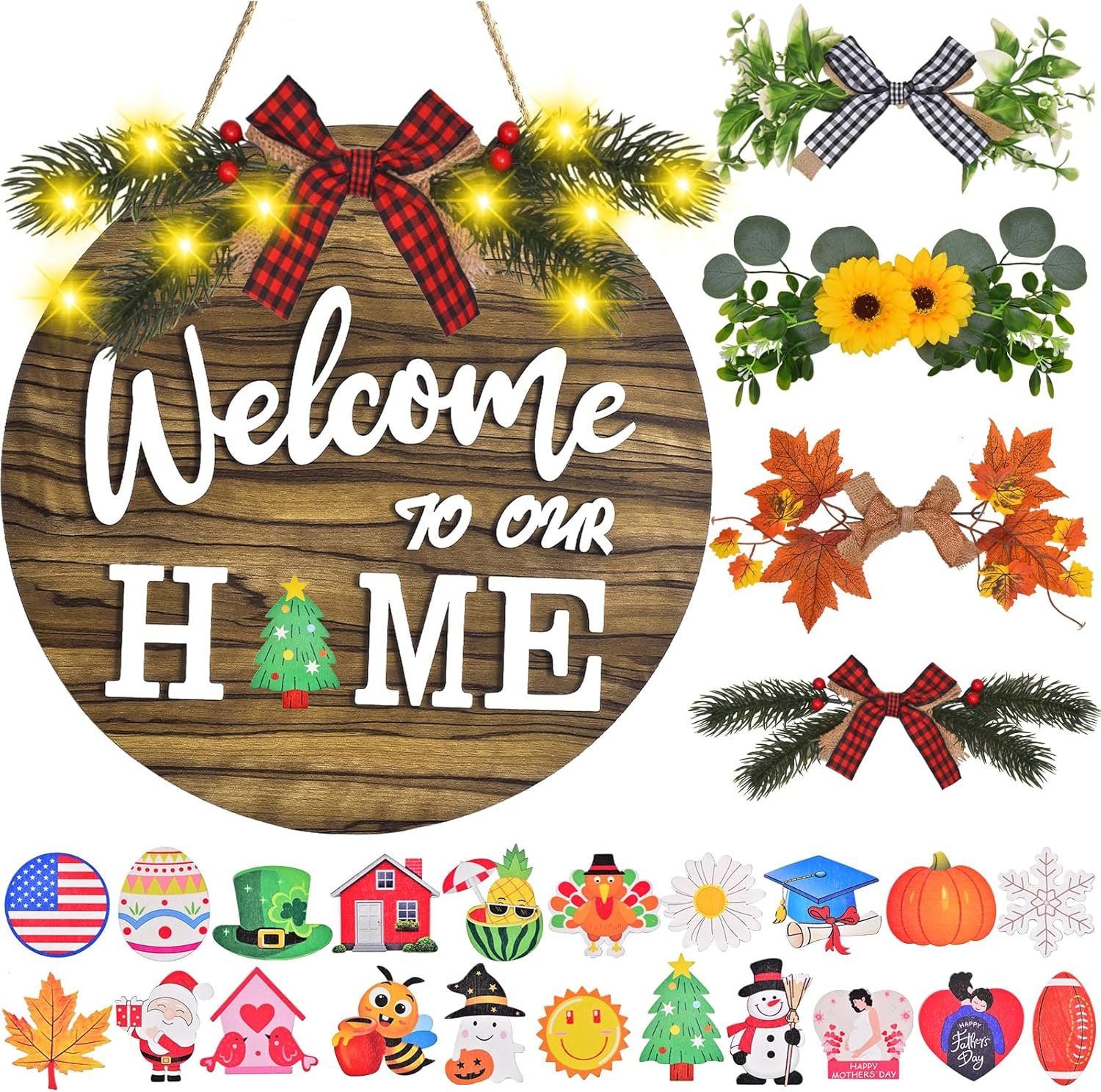 ✔ The interchangeable welcome sign comes with 4 seasonal decoration options, each featuring realistic and high-quality artificial flowers and plants.