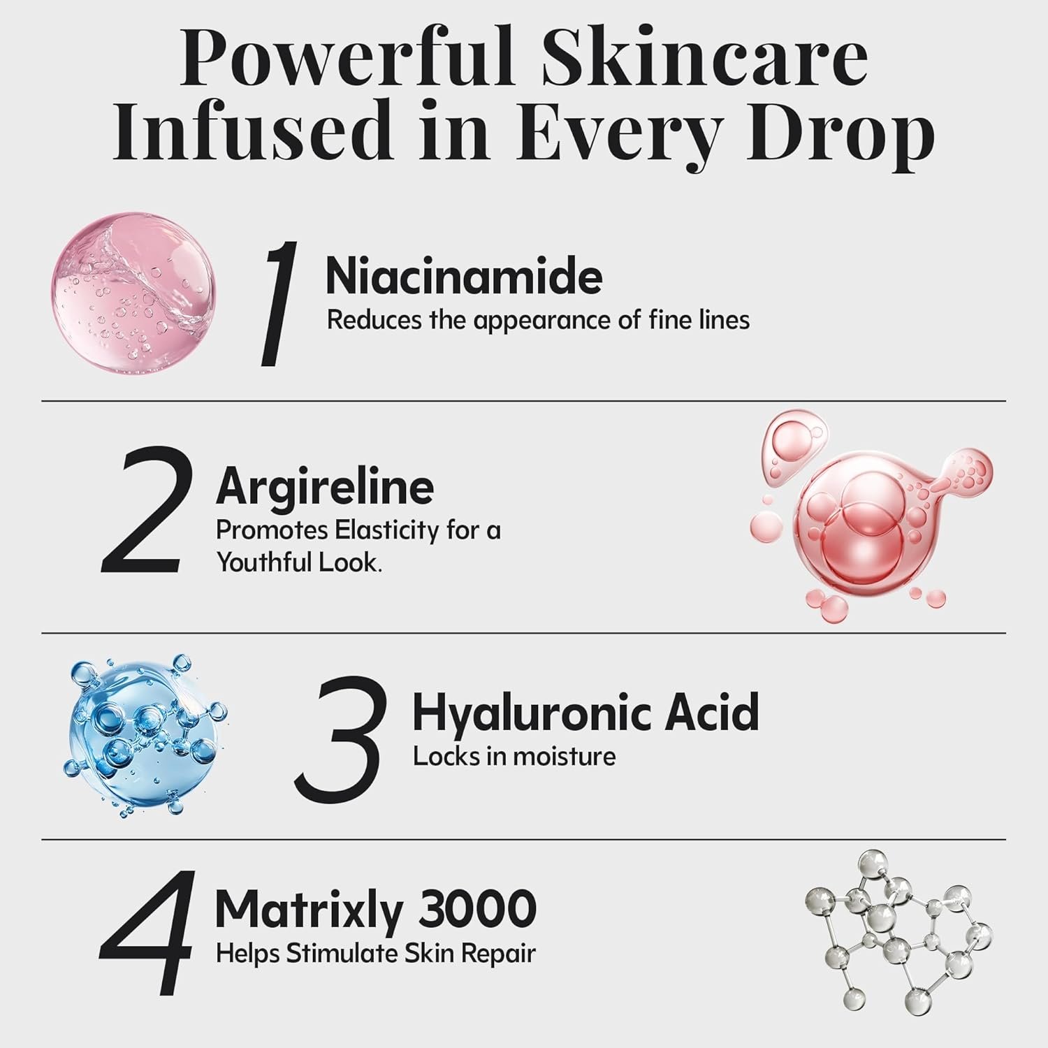 Skincare-Enhanced Elegance: Infused with potent actives including Hyaluronic Acid, Niacinamide, Argireline, Matrixyl 3000, and essential vitamins. Our liquid foundation provides immediate benefits and long-term anti-aging results.