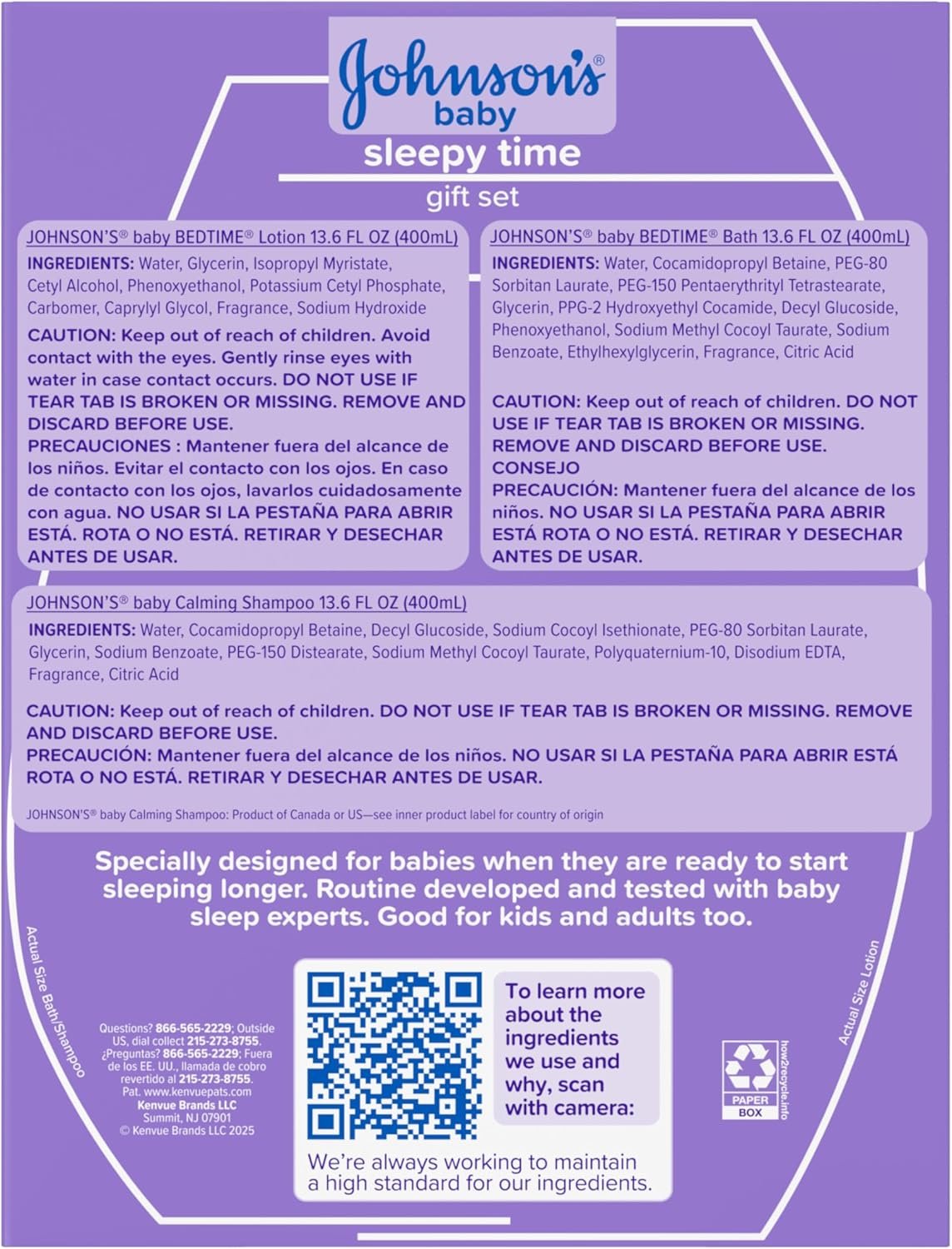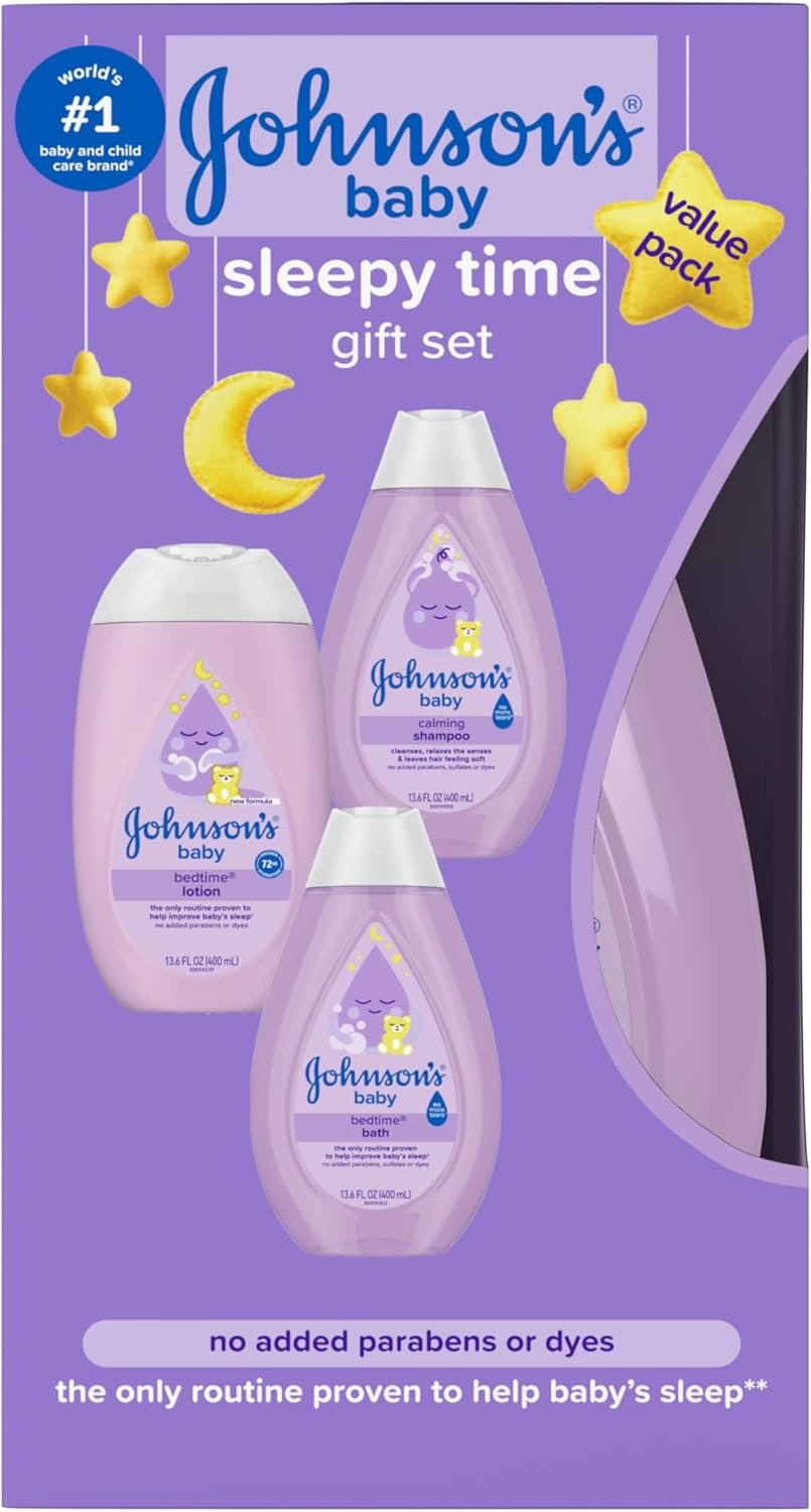 Help relax baby before bed with this Johnson’s Baby Sleepy Time Gift Set from the world’s #1 baby & childcare brand.* Featuring NatualCalm aromas to help comfort and soothe baby before bed, these bedtime essentials are part of Johnson’s clinically proven 3-step nighttime routine of bath, gentle massage & quiet time, the only routine proven to help baby’s sleep. This gift set includes Bedtime Baby Bath Wash to gently cleanse delicate skin, Calming Tear-Free Shampoo that leaves hair soft, shiny & smelling fresh, and Bedtime Baby Lotion that nourishes delicate skin. All baby skincare products are gentle, hypoallergenic and free of parabens, sulfates, and dyes. Perfect for new or expecting parents, this gift set makes a thoughtful baby shower gift and helps create relaxing nighttime bonding moments. *Source Euromonitor International Limited; Beauty & Personal Care 2024 ed. as per Baby & Child-Specific Products category; all retail channels; value sales at RSP; 2023 data.