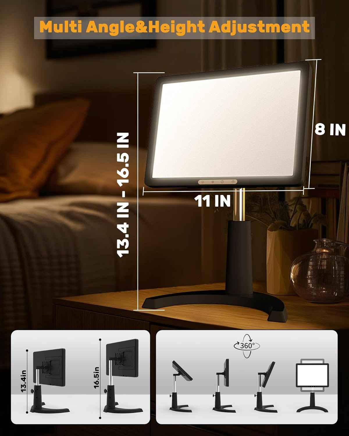 Height & Angle Adjustable Sunlight Lamp: This light therapy lamp a 360° horizontal rotation and 180° vertical adjustment, The fixture can be raised by loosening the knob, you can position the lamp in any direction to ensure optimal light exposure. Ideal for desk work, reading, or relaxing.