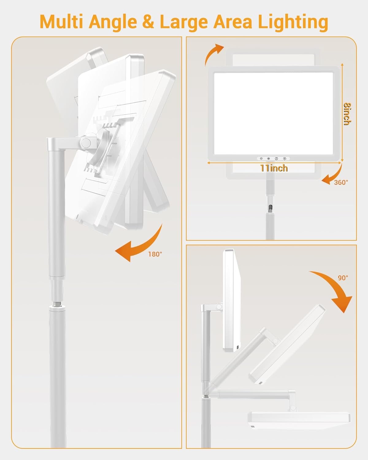 Sleek, Space-Saving Design: The 4 in 1 desigh is compact and modern, serving as a floor lamp, desk lamp, and flat light that can seamlessly fit on the ground, your desk, bedside table, or countertop, and can be easily carried. The lamp surface can be horizontally rotated 360 ° and vertically adjusted 180 °. You can place the lamp in any direction to ensure optimal exposure. Very suitable for office work, reading, or relaxation