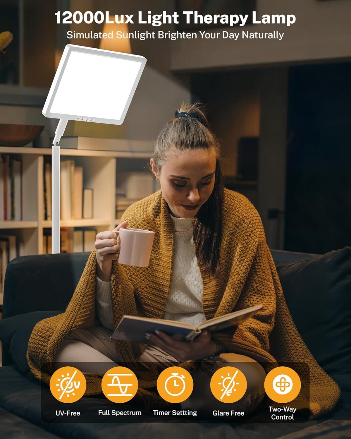 Full-Spectrum, UV-Free Light: Emits 12,000 lux of bright, natural light –helping to adjust your mood, improve sleep quality and low energy, enhance focus, and keep you energized throughout the day.Ideal for boosting mood and increasing productivity during dark winter months or in low-light environments.