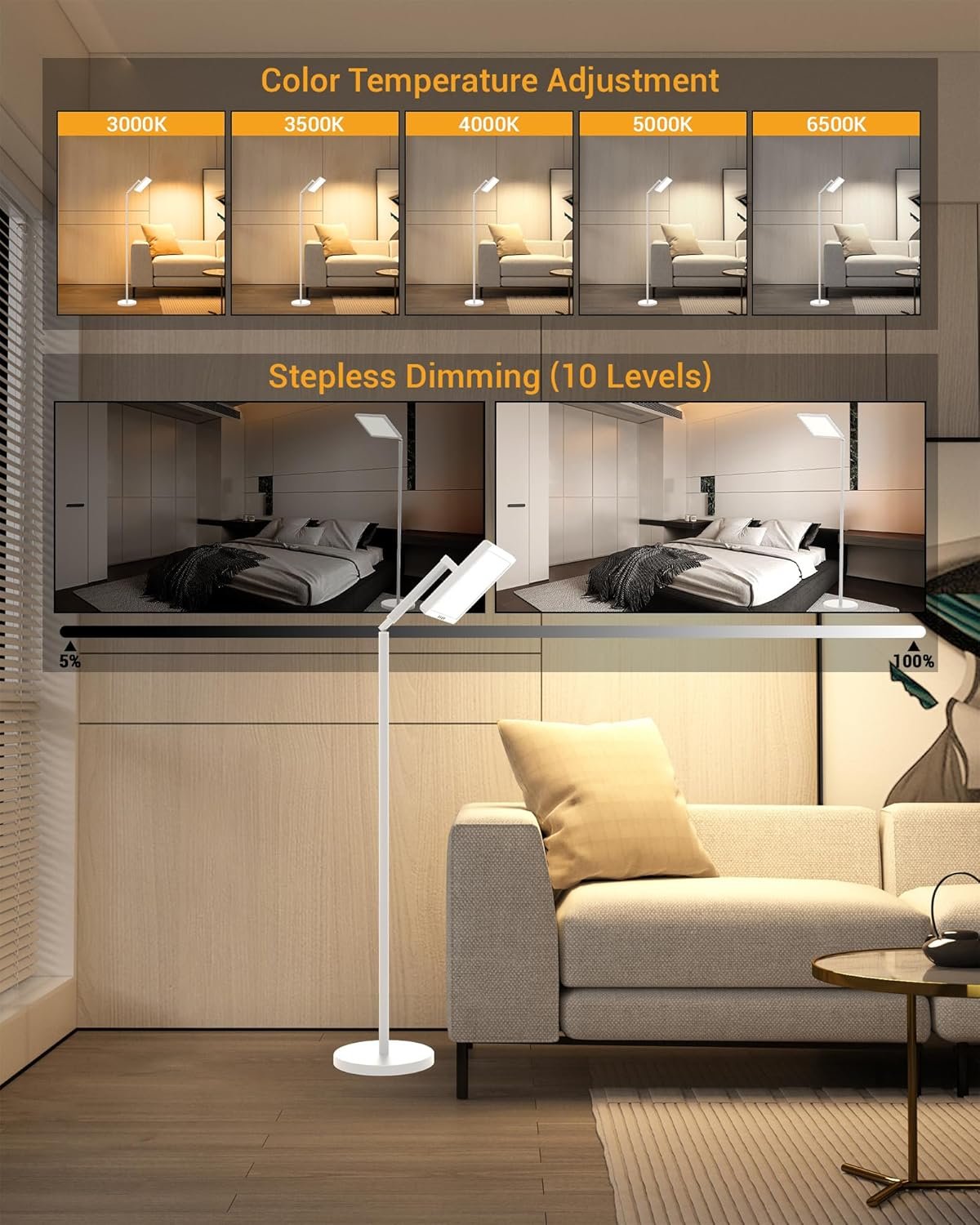 Customizable for Your Routine: Adjust brightness of 10 levels (0%-100%) and color temperatureof 5 modes(3000K/3500K/4000K/5000K/6500K) to fit your environment, and switch between warm and cool light modes. Perfect for mornings to kickstart your day, afternoons to fight fatigue, or evenings to support relaxation