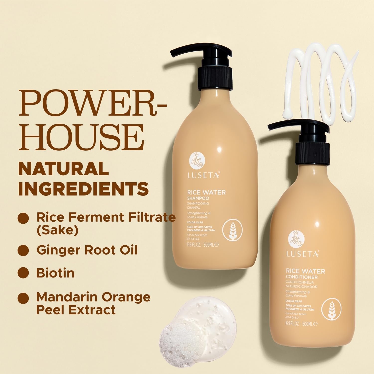 Strengthen & Nourish: Our rice water shampoo and conditioner set, enriched with Rice Ferment Filtrate (Sake) and Biotin, boosts shine and promotes healthier-looking hair. Gentle yet effective for daily use.