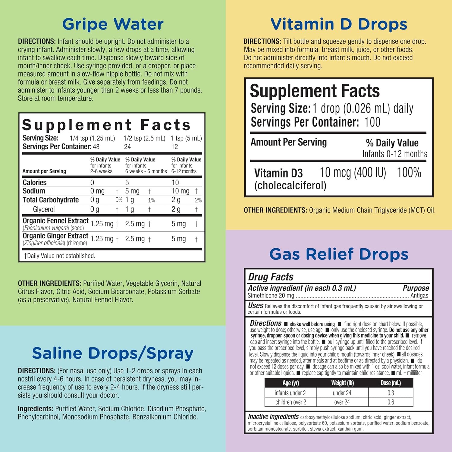 Collection of four of our most popular wellness products: Our Gripe Water and Gas Relief Drops to help calm tummy troubles*, Vitamin D Drops to promote healthy growth*, and Saline Drops to help with sniffles