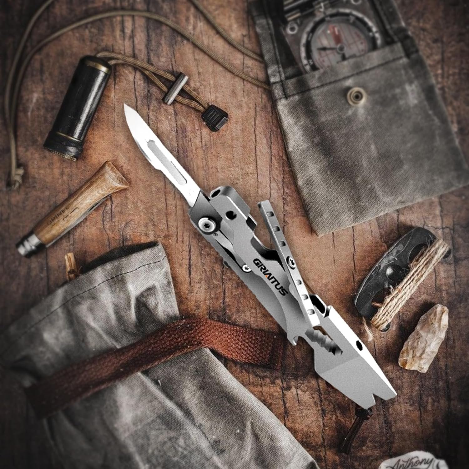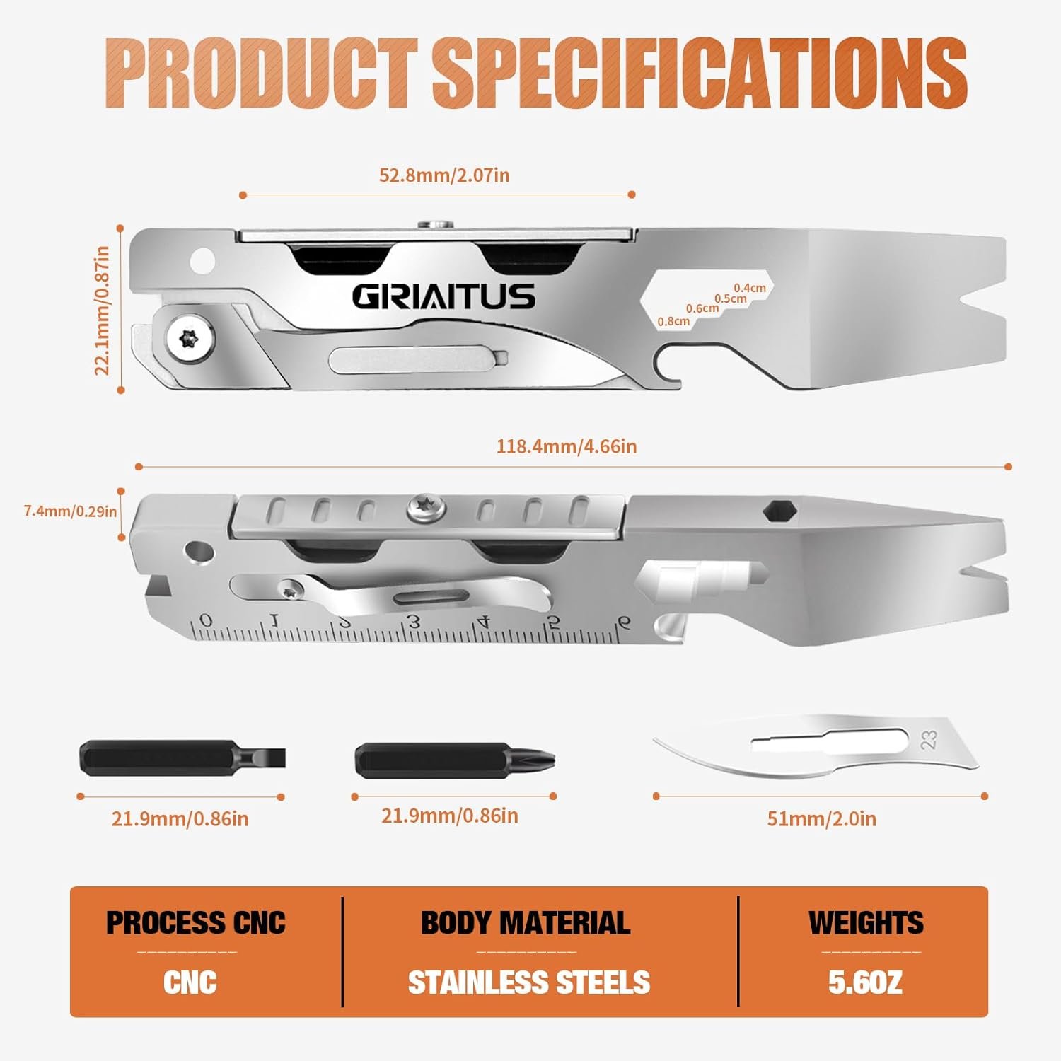 Multitool Tool for Prying: Measures 0.23lb, 4.6*0.86*0.3 inch. Lightweight and small, longest lasting striking tools, this multitool box cutter for backpacking, hiking, hunting,outdoors activities. An ideal christmas stocking stuffers gifts for men